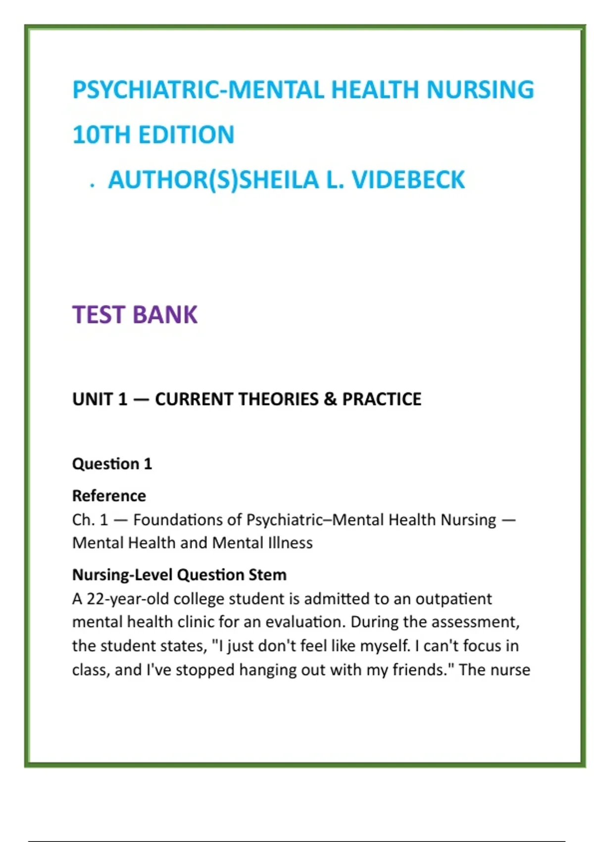 Psychiatric–Mental Health Nursing Test Bank (Videbeck 10th Ed) | NCLEX-Style Psych Nursing MCQs & Therapeutic Communication 2) SEO Product Description (200–300 words) Master psychiatric–mental health nursing with confidence using this comprehensive Psychiatric–Mental Health Nursing Test Bank for Sheila L. Videbeck’s 10th Edition—a rigorously developed, exam-focused study resource designed to support academic success and NCLEX-RN® readiness. This digital test bank provides full textbook coverage across all units and chapters, featuring 20 NCLEX-style multiple-choice questions per chapter, each paired with clear, evidence-based rationales. The content reinforces core psychiatric nursing concepts while strengthening clinical judgment, therapeutic communication, safety awareness, and ethical decision-making in real-world mental health scenarios. Grounded in the authoritative framework of Sheila L. Videbeck, a globally trusted leader in psychiatric–mental health nursing education, this resource mirrors the depth, scope, and clinical relevance of the textbook. Questions integrate clinical judgment models, priority-setting, and patient-centered care, ensuring learners can translate theory into safe and effective psychiatric nursing practice. Designed for efficiency and impact, this test bank helps nursing students save time, identify knowledge gaps, reinforce high-yield concepts, and build exam confidence across all major mental health content areas. Ideal for: Psychiatric–Mental Health Nursing (PMHN) Behavioral Health & Psychosocial Nursing Mental Health Nursing theory and clinical courses NCLEX-RN® psychiatric nursing preparation Clinical mental health rotations and skills validation Key Features: Full-chapter coverage of Videbeck’s Psychiatric–Mental Health Nursing, 10th Edition 20 clinically accurate NCLEX-style MCQs per chapter Detailed rationales for correct and incorrect options Therapeutic communication and clinical judgment scenarios Coverage of psychopharmacology, disorders, crisis care, and legal–ethical issues A high-impact study tool for mastering psychiatric nursing—academically rigorous, clinically relevant, and exam-driven. 3) 8 High-Value SEO Keywords psychiatric mental health nursing test bank Videbeck psychiatric nursing 10th edition mental health nursing study guide psych nursing MCQs NCLEX psychiatric nursing questions therapeutic communication nursing test bank behavioral health nursing exam prep psychiatric nursing clinical judgment questions 4) 10 Hashtags #PsychiatricNursing #MentalHealthNursing #VidebeckNursing #PsychNursingTestBank #NCLEXPsychPrep #TherapeuticCommunication #BehavioralHealthNursing #NursingExamPrep #PMHNNursing #NursingStudents