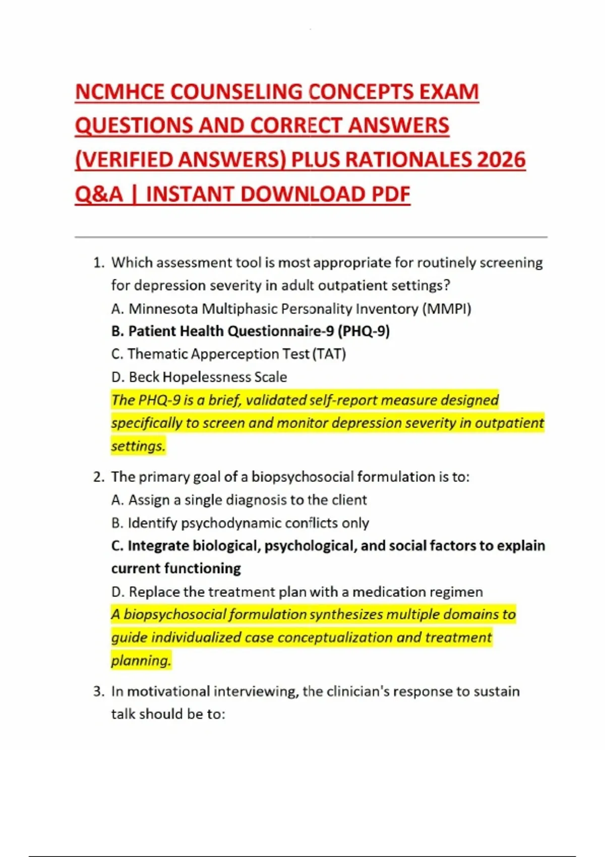 NCMHCE COUNSELING CONCEPTS EXAM QUESTIONS AND CORRECT ANSWERS (VERIFIED ANSWERS) PLUS RATIONALES 2026 Q&A | INSTANT DOWNLOAD PDF