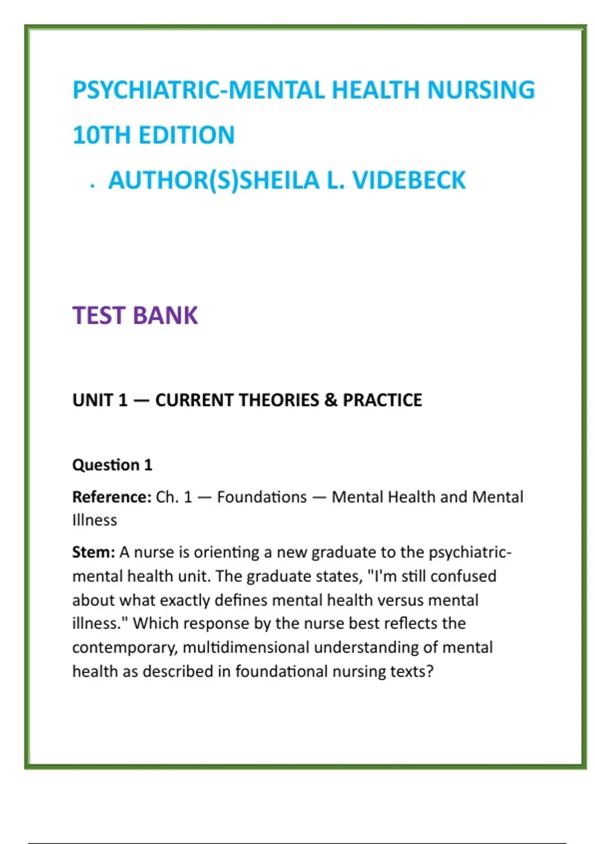 Psychiatric–Mental Health Nursing Test Bank | Videbeck 10th Edition | NCLEX-Style Psych Nursing MCQs & Therapeutic Communication 2) SEO Product Description (200–300 words) Master psychiatric–mental health nursing with this comprehensive digital test bank aligned precisely to Sheila L. Videbeck’s Psychiatric–Mental Health Nursing, 10th Edition—the gold-standard text used worldwide in PMHN education. Designed for exam success and clinical excellence, this resource delivers full-chapter coverage with 20 rigorously constructed NCLEX-style MCQs per chapter, complete with detailed, evidence-based rationales that reinforce critical thinking and safe mental health practice. Each question set emphasizes clinical judgment, therapeutic communication, and patient-centered psychiatric care, enabling learners to confidently apply theory to real-world mental health scenarios. Content spans the full spectrum of psychiatric nursing, including mental health assessment, nurse–patient relationships, psychopharmacology, anxiety and mood disorders, psychotic and personality disorders, substance-related conditions, cognitive disorders, crisis intervention, and legal–ethical considerations. This exam-focused digital product is ideal for nursing students and educators seeking a time-efficient, high-yield study solution that strengthens prioritization, safety awareness, ethical decision-making, and NCLEX-RN® readiness. Whether preparing for unit exams, comprehensive finals, clinical rotations, or licensure review, this test bank transforms complex psychiatric concepts into measurable mastery. Perfect for courses and programs such as: Psychiatric–Mental Health Nursing (PMHN) Behavioral Health Nursing Mental Health & Psychosocial Nursing NCLEX-RN® psychiatric nursing preparation Clinical mental health rotations and skills validation Key Features Full coverage of all chapters in Videbeck’s 10th Edition 20 NCLEX-style psych nursing MCQs per chapter In-depth rationales for every correct answer Strong focus on therapeutic communication and clinical judgment Digital, printable, and immediately accessible format Authored in alignment with Sheila L. Videbeck’s globally trusted framework, this test bank is a powerful tool for achieving confidence and competence in psychiatric–mental health nursing. 3) 8 High-Value SEO Keywords psychiatric mental health nursing test bank Videbeck psychiatric nursing 10th edition psych nursing MCQs mental health nursing study guide NCLEX psychiatric nursing questions therapeutic communication nursing questions behavioral health nursing test bank psychiatric nursing exam prep 4) 10 Hashtags #PsychiatricNursing #MentalHealthNursing #Videbeck #PsychNursingTestBank #NCLEXPsychPrep #TherapeuticCommunication #BehavioralHealthNursing #NursingStudents #NursingExamPrep #ClinicalJudgment