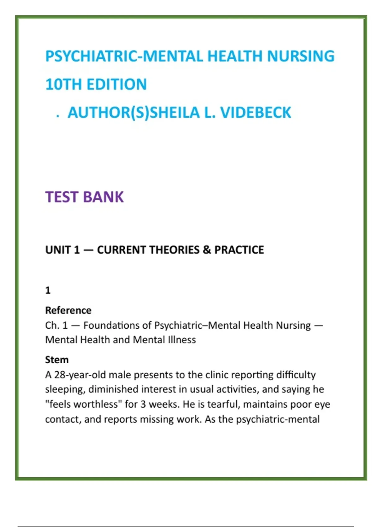 Psychiatric–Mental Health Nursing Test Bank | Videbeck 10th Ed | NCLEX-Style Psych Nursing MCQs & Study Guide 2) SEO Product Description (200–300 words) Master psychiatric–mental health nursing with confidence using this comprehensive digital test bank aligned to Sheila L. Videbeck’s Psychiatric–Mental Health Nursing, 10th Edition—a globally trusted authority in mental health nursing education. This exam-focused resource delivers FULL textbook coverage across ALL units and chapters, with 20 clinically accurate NCLEX-style MCQs per chapter, each paired with clear, evidence-based rationales. Every question is designed to strengthen clinical judgment, therapeutic communication, and patient-centered decision-making—the skills most tested in modern nursing programs and on the NCLEX-RN®. Built for efficiency and results, this test bank saves time while reinforcing high-yield concepts across mental health assessment, nurse–patient relationships, psychopharmacology, anxiety and mood disorders, psychotic and personality disorders, substance-related and cognitive disorders, plus crisis intervention, safety priorities, and legal-ethical responsibilities. Scenarios reflect real-world psychiatric nursing practice, helping learners translate theory into safe, effective care. Ideal for: Psychiatric–Mental Health Nursing (PMHN) Behavioral Health & Psychosocial Nursing Mental Health Nursing theory and clinical courses NCLEX-RN® psychiatric nursing preparation Clinical mental health rotations and skills validation Key Features FULL chapter-by-chapter coverage (Videbeck 10th Ed) 20 NCLEX-style MCQs per chapter Detailed rationales for every option Clinical judgment & therapeutic communication focus Digital, printable, and self-paced Perfect for nursing students and educators seeking exam readiness, deeper understanding, and confident performance in psychiatric–mental health nursing. 3) 8 High-Value SEO Keywords psychiatric mental health nursing test bank Videbeck psychiatric nursing psych nursing MCQs mental health nursing study guide NCLEX psychiatric nursing questions therapeutic communication nursing behavioral health nursing test bank psychiatric nursing exam prep 4) 10 Hashtags #PsychiatricNursing #MentalHealthNursing #Videbeck #PsychNursingTestBank #NCLEXPsych #TherapeuticCommunication #BehavioralHealthNursing #NursingExamPrep #NCLEXRN #NursingStudents