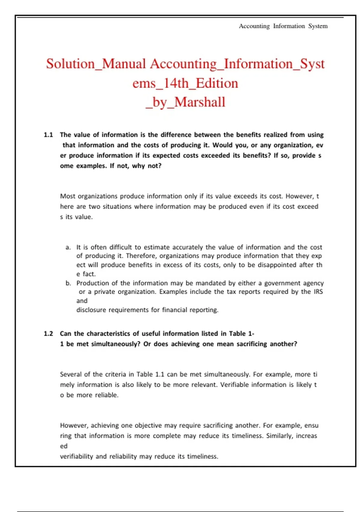 Secure a Grade A+ in your accounting courses with the Complete Solution Manual for Accounting Information Systems, 14th Edition by Romney and Steinbart. This comprehensive resource provides verified answers, step-by-step guidance for complex problems, and detailed solutions for the latest academic standards. What is Included: • Full Chapter Coverage: Comprehensive solutions for Chapters 1 through 18, ranging from foundational AIS concepts to advanced database implementation. • Internal Control & Security: In-depth answers regarding fraud prevention, computer abuse techniques, and information systems security (IS Security). • The Business Cycles: Complete walkthroughs of the Revenue, Expenditure, Production, and HRM/Payroll cycles, including detailed BPMN and DFD diagrams. • Advanced Data Modeling: Expert solutions for REA data modeling, XBRL reporting, and relational database design. • Excel Mastery Projects: Detailed instructions and solutions for Excel-based projects, including Data Validation, PivotTables, and Benford’s Law analysis. Key Topics Mastered: • System Integrity: Mastery of processing integrity and availability controls. • Auditing AIS: Full guides on auditing computer-based information systems using CAATTs. • Relational Databases: Practical applications of primary and foreign keys, normalization, and SQL query logic. • Modern Business Technology: Insights into ERP systems, cloud computing, and virtualization security. This solution manual is the ultimate tool for accounting students looking to bridge the gap between technical IT concepts and professional financial reporting.