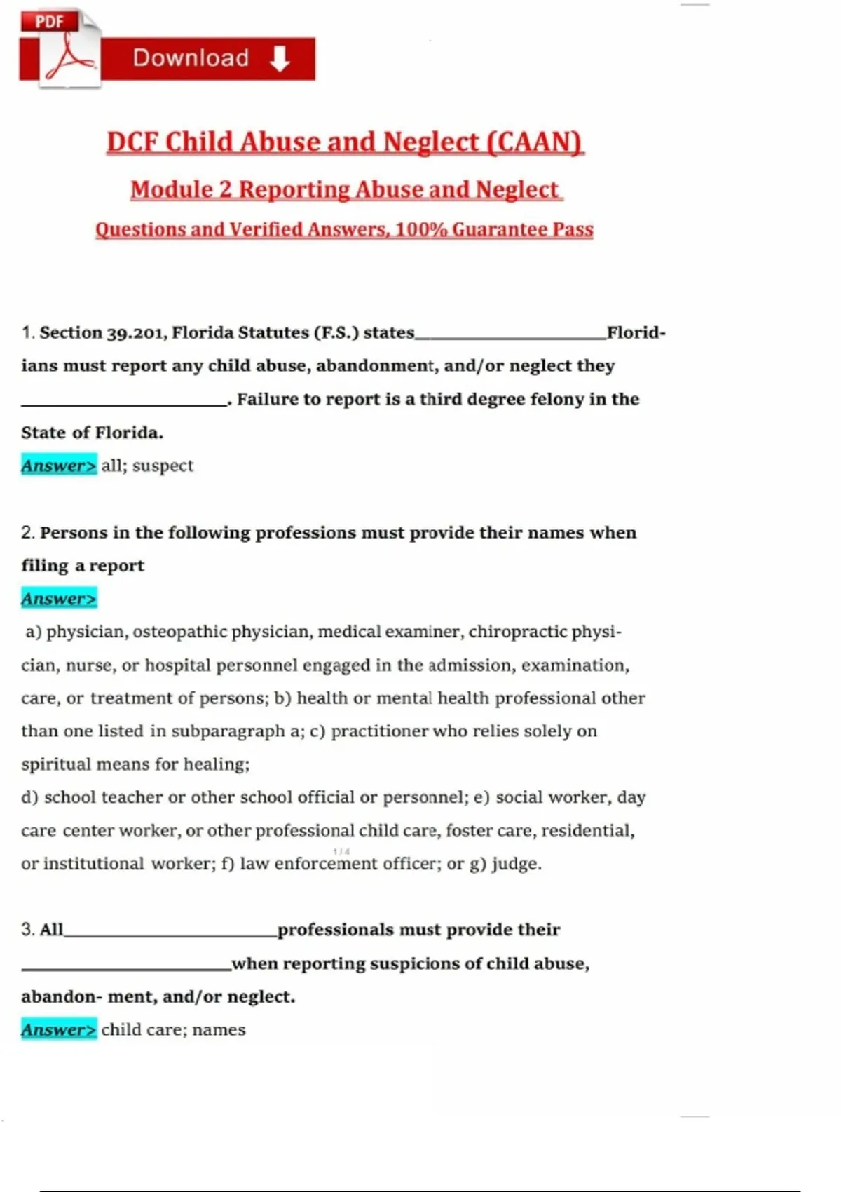 DCF Child Abuse and Neglect (CAAN) Module 2 - Reporting Abuse and Neglect Latest 100% Guide!!.pdf