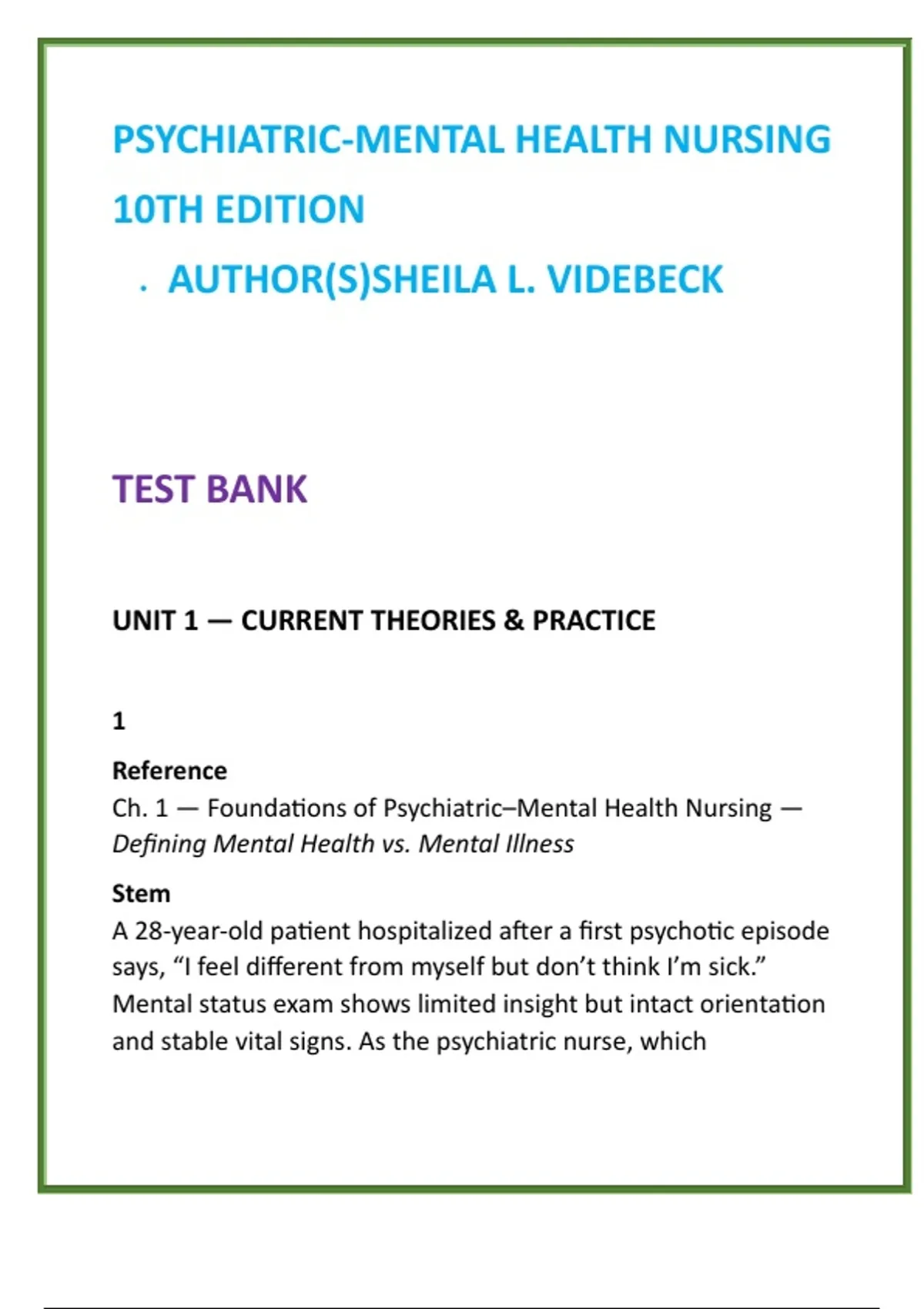 Psychiatric–Mental Health Nursing Test Bank | Videbeck 10th Ed | NCLEX-Style Psych Nursing MCQs & Rationales 2) SEO Product Description (200–300 words) Master psychiatric–mental health nursing with confidence using this comprehensive NCLEX-style test bank based on Sheila L. Videbeck’s Psychiatric–Mental Health Nursing, 10th Edition—the most trusted textbook in mental health nursing education worldwide. This full-coverage digital test bank includes ALL units and chapters, with 20 high-quality NCLEX-style multiple-choice questions (MCQs) per chapter, each paired with clear, evidence-based rationales. Questions are written at the application, analysis, and clinical judgment levels, emphasizing therapeutic communication, patient safety, ethical decision-making, and prioritization—exactly what is tested in psychiatric nursing exams and the NCLEX-RN®. Every question integrates realistic psychiatric clinical scenarios, requiring learners to think like a nurse, not memorize facts. Content reinforces mental health assessment, nurse–patient relationships, psychopharmacology, anxiety, mood, psychotic, personality, substance-related, and cognitive disorders, as well as crisis intervention, legal standards, and trauma-informed care. This resource is ideal for students who want a time-efficient, exam-focused study tool that builds confidence and clinical reasoning for both coursework and licensure preparation. Key Features FULL textbook coverage of Videbeck’s 10th Edition 20 NCLEX-style MCQs per chapter Detailed rationales for correct and incorrect options Strong focus on therapeutic communication & clinical judgment Designed for NCLEX-RN® psychiatric content mastery Perfect for Psychiatric–Mental Health Nursing (PMHN) Behavioral & Psychosocial Nursing Mental Health clinical rotations NCLEX-RN® psych nursing preparation 3) 8 High-Value SEO Keywords psychiatric mental health nursing test bank Videbeck psychiatric nursing psych nursing MCQs mental health nursing study guide NCLEX psychiatric nursing questions therapeutic communication nursing questions behavioral health nursing test bank psychiatric nursing exam prep 4) 10 Hashtags #PsychiatricNursing #MentalHealthNursing #Videbeck #PsychNursingTestBank #NCLEXPsych #TherapeuticCommunication #NursingSchool #BehavioralHealthNursing #NCLEXPrep #NursingExams