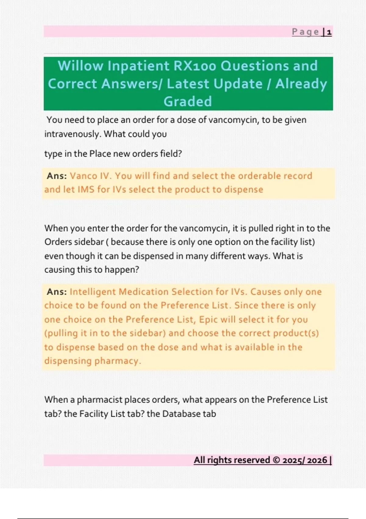 Willow Inpatient RX100 Questions and Correct Answers/ Latest Update / Already Graded
