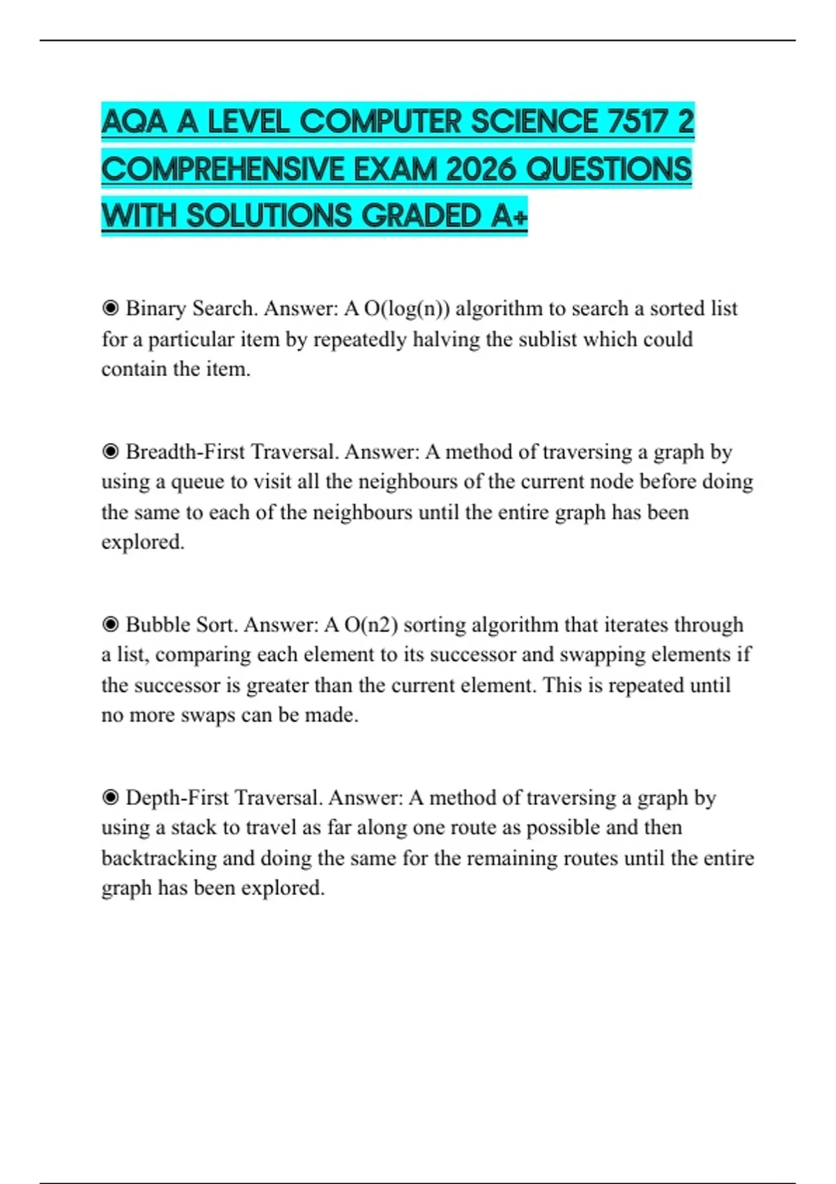 AQA A LEVEL COMPUTER SCIENCE 7517 2 COMPREHENSIVE EXAM 2026 QUESTIONS WITH SOLUTIONS GRADED A+