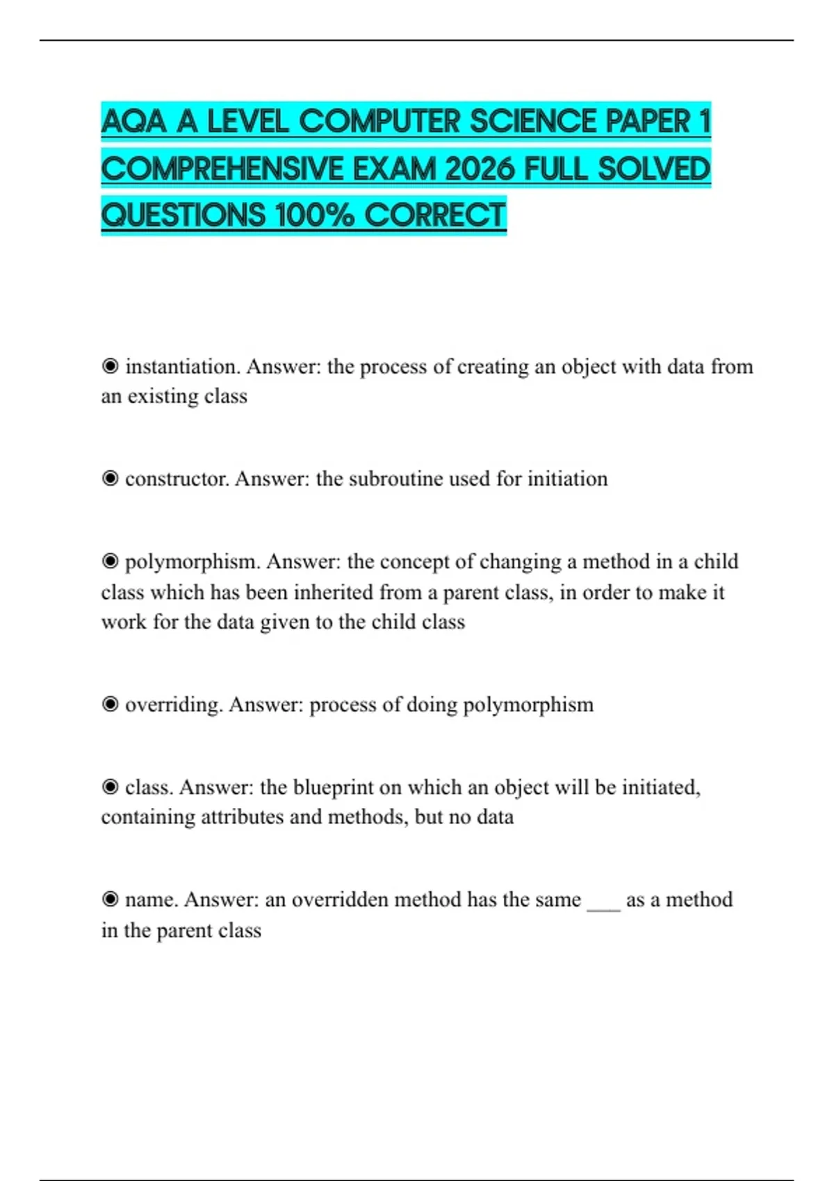 AQA A LEVEL COMPUTER SCIENCE PAPER 1 COMPREHENSIVE EXAM 2026 FULL SOLVED QUESTIONS 100% CORRECT