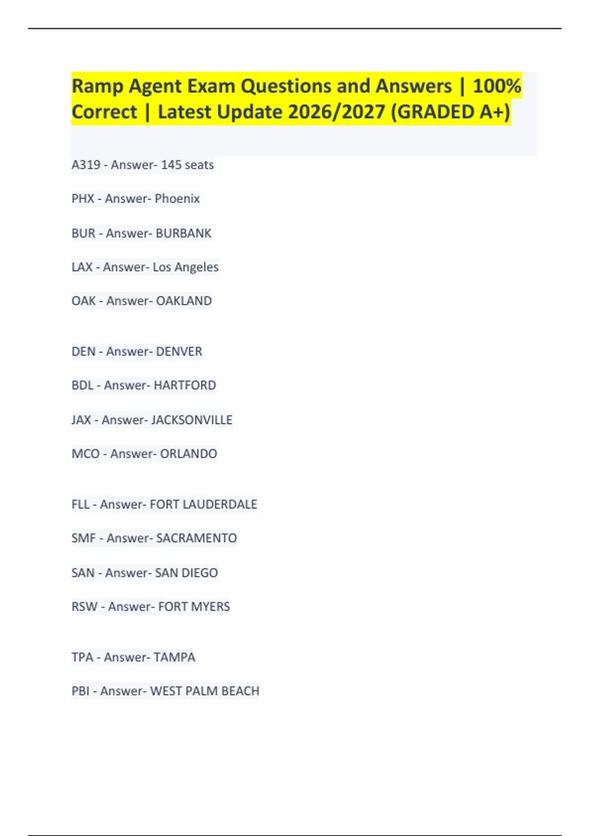Ramp Agent Exam Questions and Answers | 100% Correct | Latest Update 2026/2027 (GRADED A+) A319 - Answer- 145 seats PHX - Answer- Phoenix BUR - Answer- BURBANK LAX - Answer- Los Angeles OAK - Answer- OAKLAND DEN - Answer- DENVER BDL - Answer- HARTFORD JAX - Answer- JACKSONVILLE
