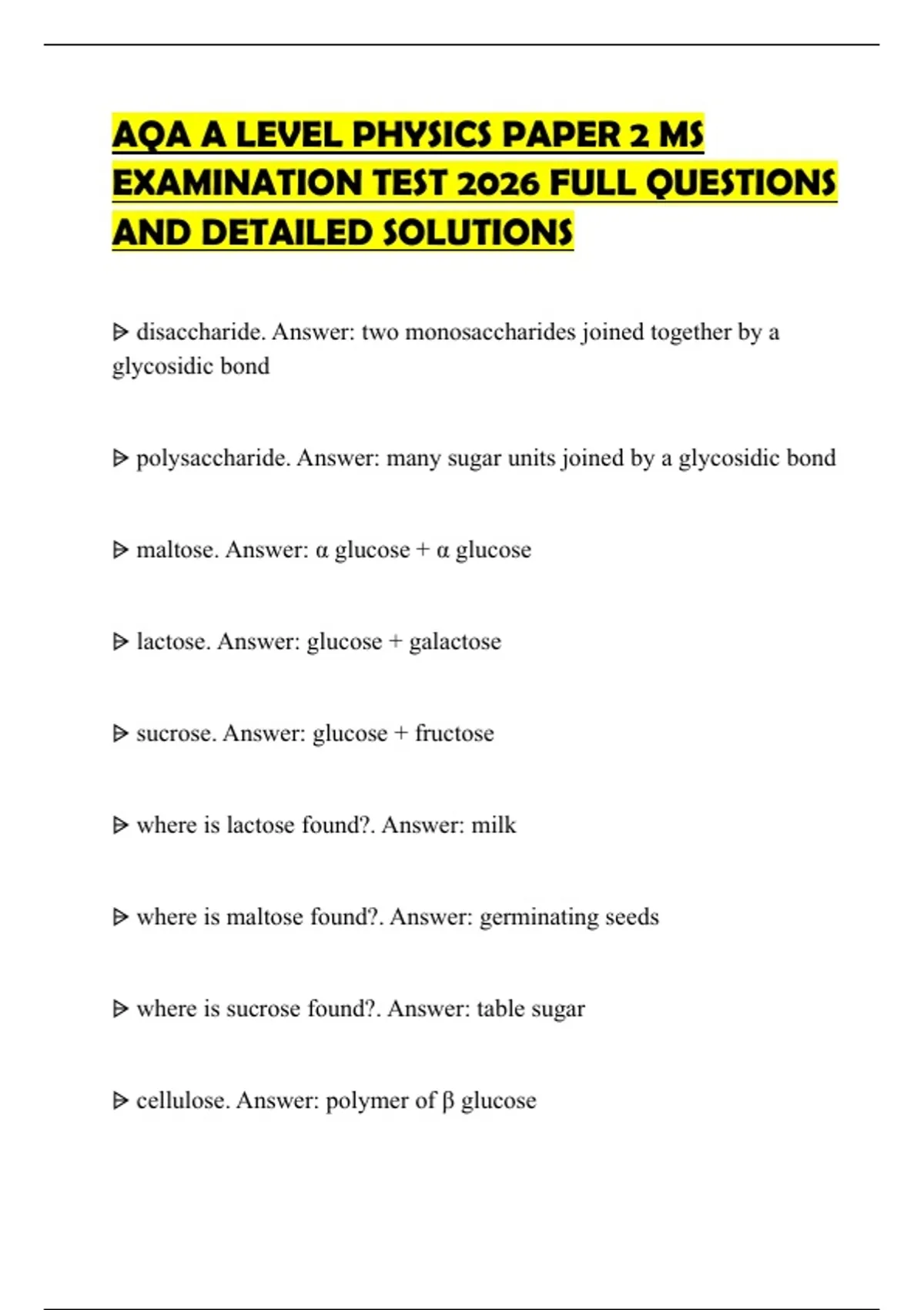 , ⩥ starch. Answer: polymer of α glucose (amylose + amylopectin)