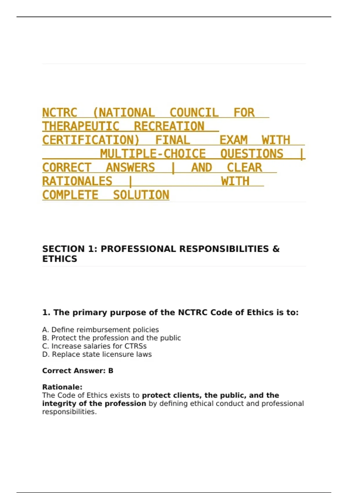 NCTRC (NATIONAL COUNCIL FOR THERAPEUTIC RECREATION CERTIFICATION) FINAL EXAM WITH 100 MULTIPLE-CHOICE QUESTIONS | CORRECT ANSWERS | AND CLEAR RATIONALES | 2026 WITH COMPLETE SOLUTION