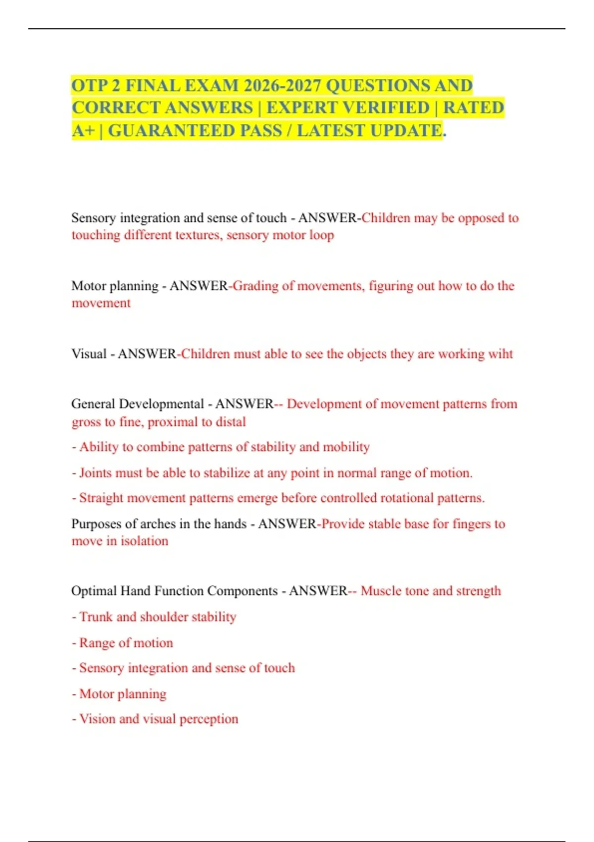 OTP 2 FINAL EXAM QUESTIONS AND CORRECT ANSWERS | EXPERT VERIFIED | RATED A+ | GUARANTEED PASS / LATEST UPDATE. Sensory integration and sense of touch - ANSWER-Children may be opposed to touching different textures, sensory motor loop Motor planning - ANSWER-Grading of movements, figuring out how to do the movement Visual - ANSWER-Children must able to see the objects they are working wiht General Developmental - ANSWER-- Development of movement patterns from gross to fine, proximal to distal - Ability to combine patterns of stability and mobility - Joints must be able to stabilize at any point in normal range of motion. - Straight movement patterns emerge before controlled rotational patterns. Purposes of arches in the hands - ANSWER-Provide stable base for fingers to move in isolation Optimal Hand Function Components - ANSWER-- Muscle tone and strength - Trunk and shoulder stability - Range of motion - Sensory integration and sense of touch - Motor planning - Vision and visual perception Trunk and shoulder stability - ANSWER-Proximal stability promotes distal mobility Reach - ANSWER-Extension and movement of the arm for grasping or placing objects Grasp - ANSWER-Attainment of an object with the hand Carry - ANSWER-Transportation of a handheld object from one place to another Voluntary release - ANSWER-Intentional letting go of a handheld object at a specific time and place In hand manipulation - ANSWER-Adjustment of an object in the hand after grasp Bilateral hand use - ANSWER-Use of two hands together to accomplish an activity Review grasp progression - ANSWER-Slide 7 Relation of hand skills to children's occupations - ANSWER-- Play - Activities of daily living -- Dressing -- Bathing and hygiene -- Eating - School functions -- Manipulative activities -- Crayons, paper, pencil -- Scissors Components of Hand Skills - ANSWER-- Complex interaction of hand skills, postural mechanisms, cognition, visual perception - Reach - Grasp - Carry - Voluntary release - In-hand manipulation - Bilateral hand use