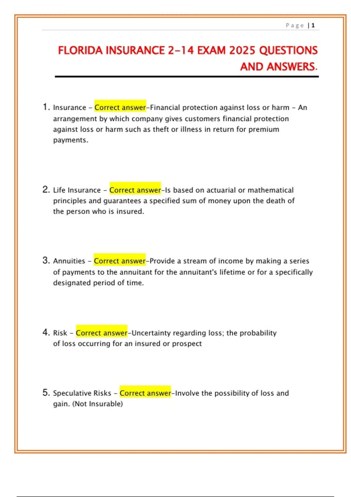 FLORIDA INSURANCE 2-14 EXAM 2025 QUESTIONS