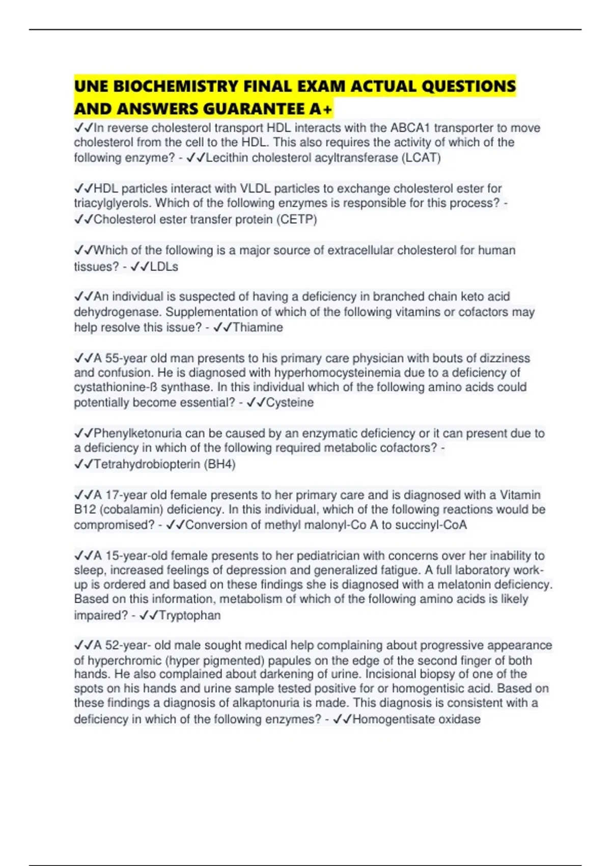 UNE BIOCHEMISTRY FINAL EXAM ACTUAL QUESTIONS AND ANSWERS GUARANTEE A+