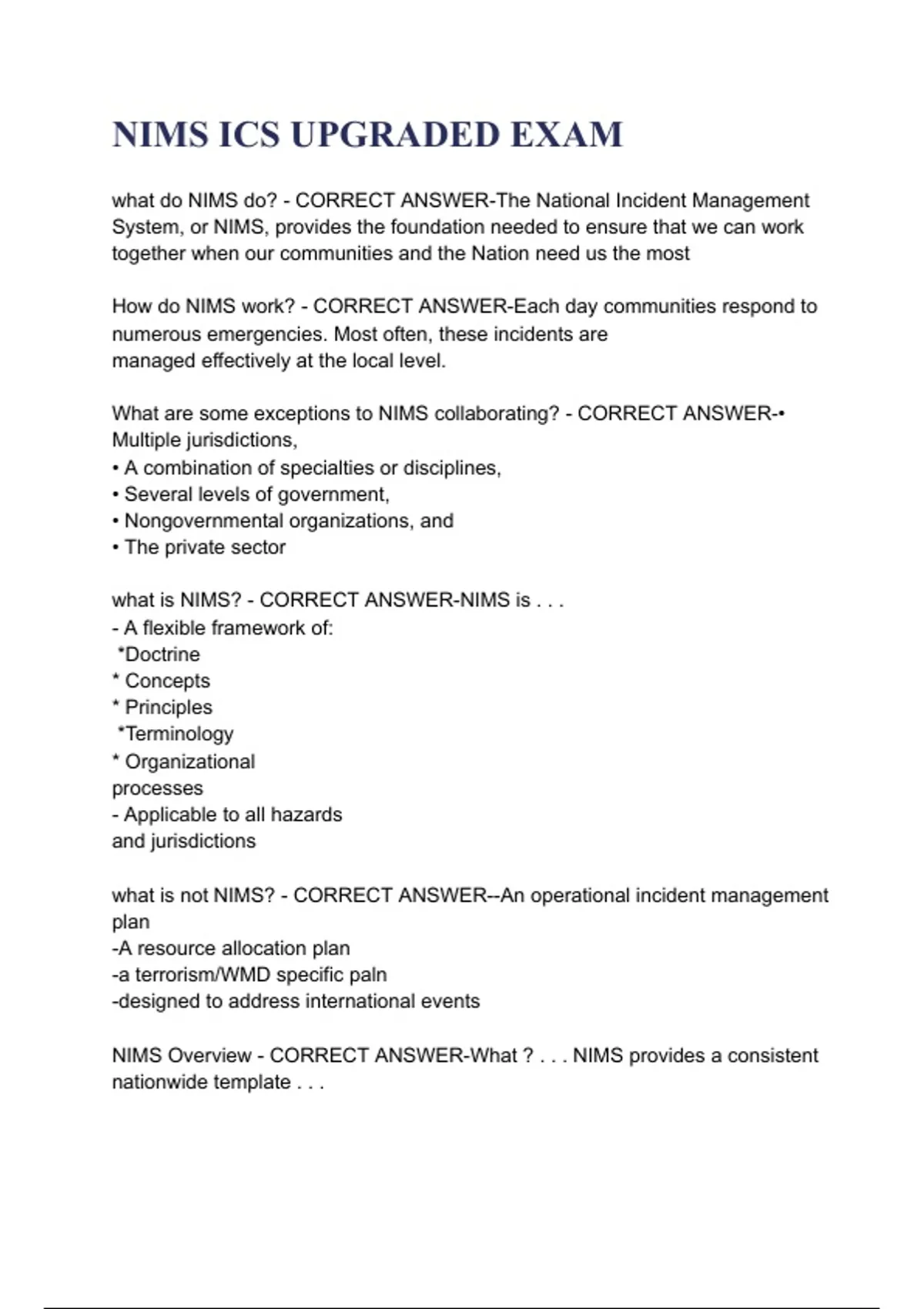 Prepare effectively with the NIMS ICS Upgraded Exam featuring updated practice questions and detailed explanations with solution. This comprehensive study guide covers Incident Command System principles, emergency management protocols, and exam-focused scenarios to improve understanding and certification success. Fully updated, accurate, and reliable 2025/ 2026 resource for students, first responders, and emergency management professionals.
