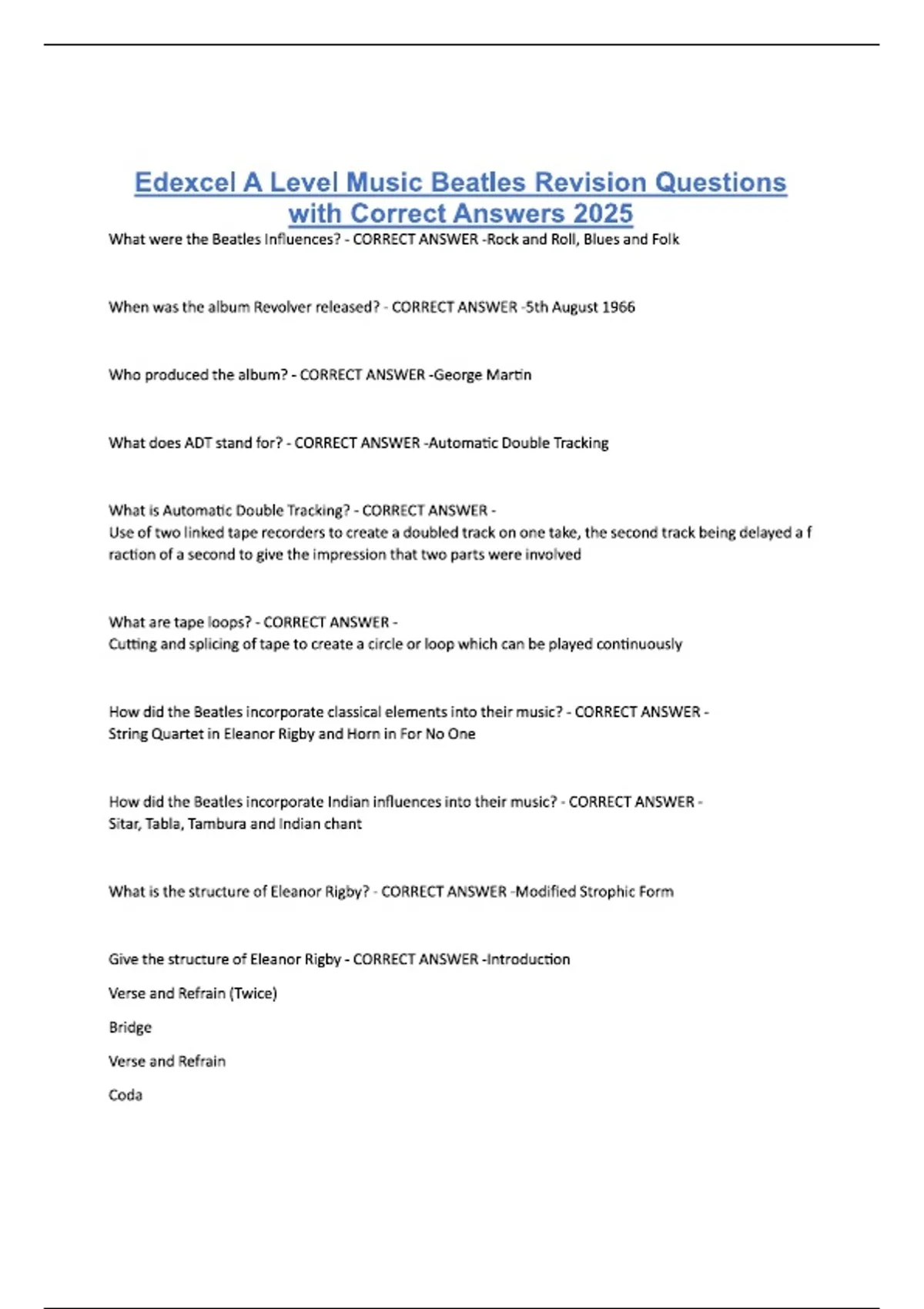 Edexcel A Level Music Beatles Revision Questions with Correct Answers