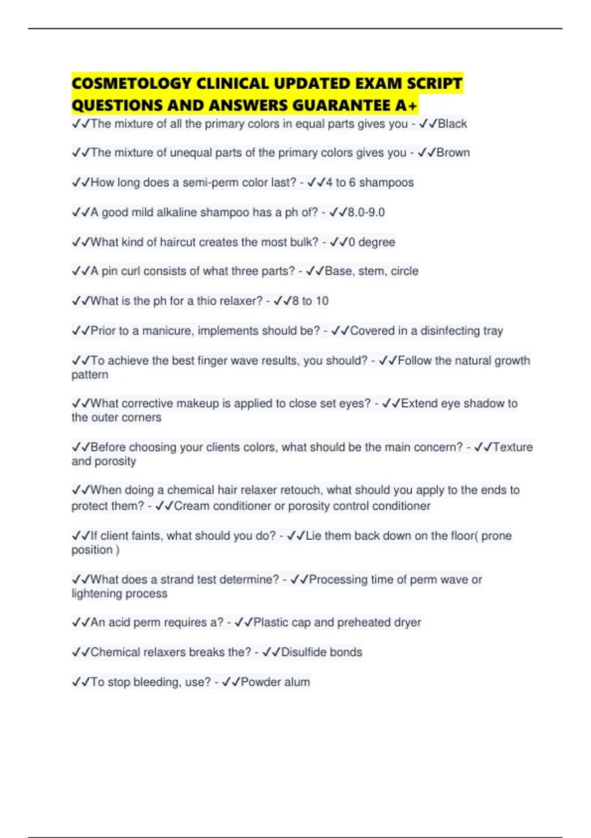 COSMETOLOGY CLINICAL UPDATED EXAM SCRIPT QUESTIONS AND ANSWERS GUARANTEE A+