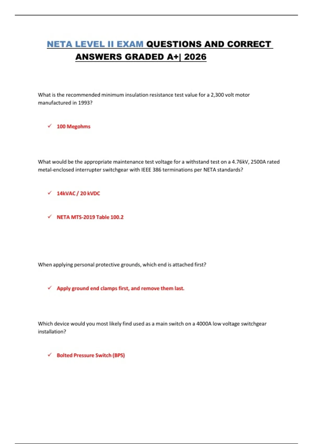 NETA LEVEL II EXAM QUESTIONS AND CORRECT