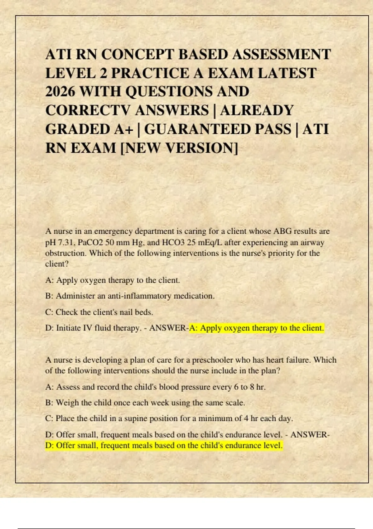 ATI RN CONCEPT BASED ASSESSMENT LEVEL 2 PRACTICE A EXAM LATEST 2026 WITH QUESTIONS AND CORRECTV ANSWERS | ALREADY GRADED A+ | GUARANTEED PASS | ATI RN EXAM [NEW VERSION] A nurse in an emergency department is caring for a client whose ABG results are pH 7.31, PaCO2 50 mm Hg, and HCO3 25 mEq/L after experiencing an airway obstruction. Which of the following interventions is the nurse's priority for the client? A: Apply oxygen therapy to the client. B: Administer an anti-inflammatory medication. C: Check the client's nail beds. D: Initiate IV fluid therapy. - ANSWER-A: Apply oxygen therapy to the client. A nurse is developing a plan of care for a preschooler who has heart failure. Which of the following interventions should the nurse include in the plan? A: Assess and record the child's blood pressure every 6 to 8 hr. B: Weigh the child once each week using the same scale. C: Place the child in a supine position for a minimum of 4 hr each day. D: Offer small, frequent meals based on the child's endurance level. - ANSWER D: Offer small, frequent meals based on the child's endurance level.