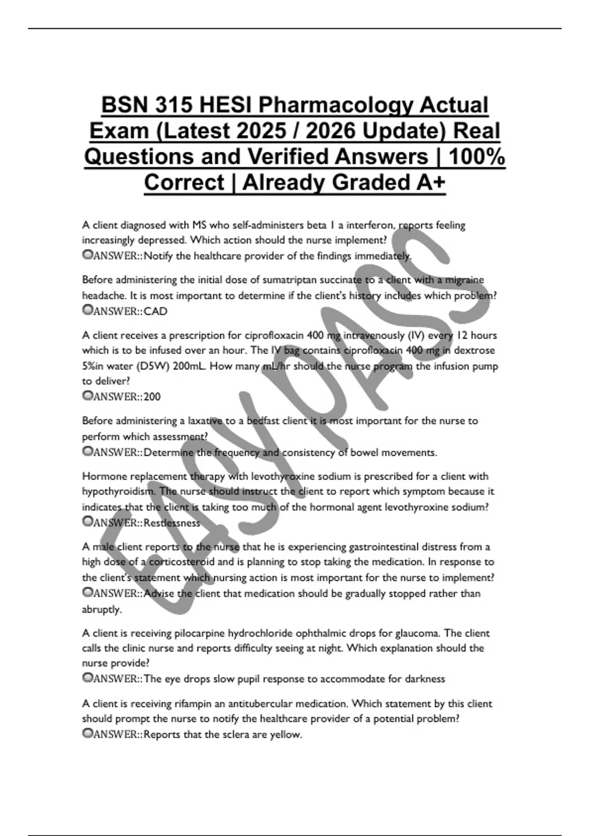 BSN 315 HESI Pharmacology Actual Exam (Latest 2025 / 2026 Update) Real Questions and Verified Answers | 100% Correct | Already Graded A+