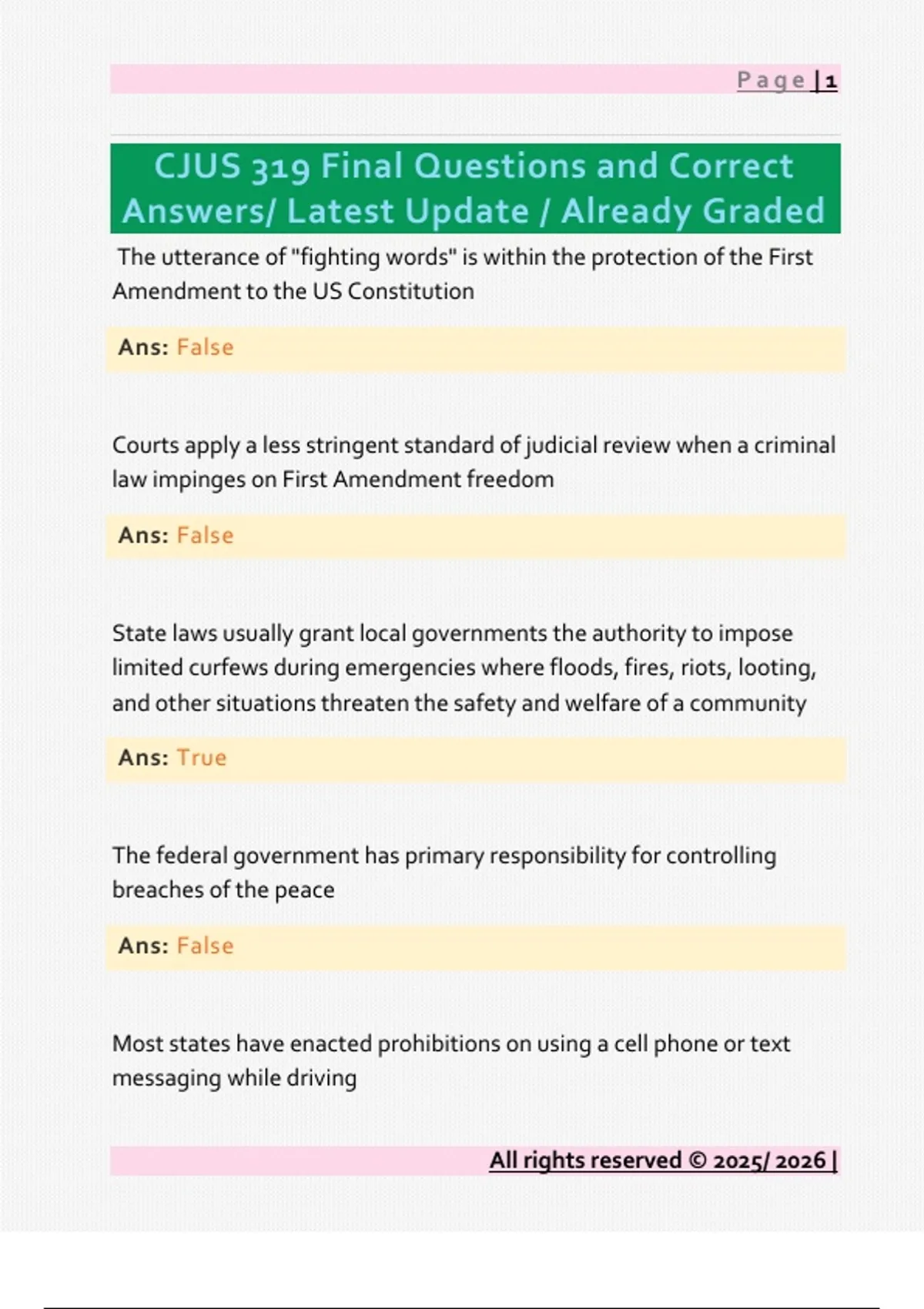 CJUS 319 Final Questions and Correct Answers/ Latest Update / Already Graded