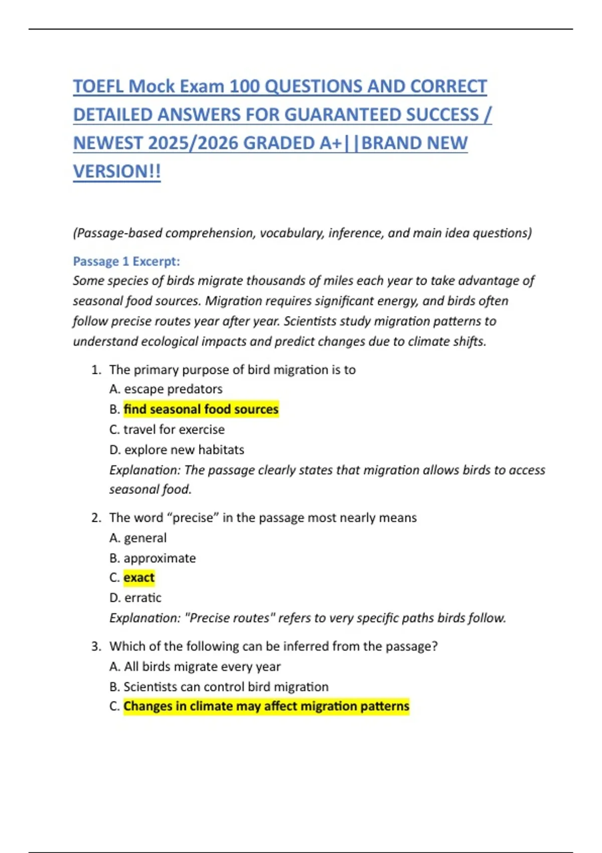 TOEFL Mock Exam 100 QUESTIONS AND CORRECT