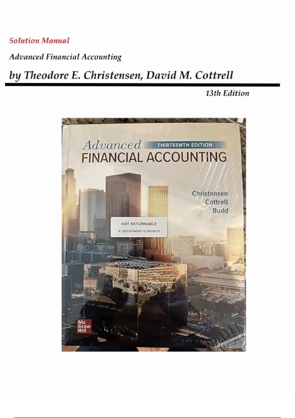 Advanced Financial Accounting – 13th Edition by Theodore E. Christensen & David M. Cottrell | Complete Solutions Manual (Chapters 1–20)... 1. Intercorporate Acquisitions and Investments in Other Entities 2. Reporting Intercorporate Investments and Consolidation of Wholly Owned Subsidiaries with No Differential, 3. The Reporting Entity and the Consolidation of Less-Than-Wholly-Owned Subsidiaries with No Differential, 4. Consolidation of Wholly Owned Subsidiaries Acquired at More Than Book Value, 5. Consolidation of Less-Than-Wholly-Owned Subsidiaries Acquired at More Than Book Value, 6. Intercompany Inventory Transactions, 7. Intercompany Transfers of Services and Noncurrent Assets, 8. Intercompany Indebtedness, 9. Consolidation Ownership Issues, 10. Additional Consolidation Reporting Issues, 11. Multinational Accounting: Foreign Currency Transactions and Financial Instrumentsm, 12. Multinational Accounting: Issues in Financial Reporting and Translation of Foreign Entity Statements, 13. Segment and Interim Reporting, 14. SEC Reporting, 15. Partnerships: Formation, Operation, and Changes in Membership, 16. Partnerships: Liquidation, 17. Governmental Entities: Introduction and General Fund Accounting, 18. Governmental Entities: Special Funds and Governmentwide Financial Statements, 19. Not-for-Profit Entities, 20. Corporations in Financial Difficulty