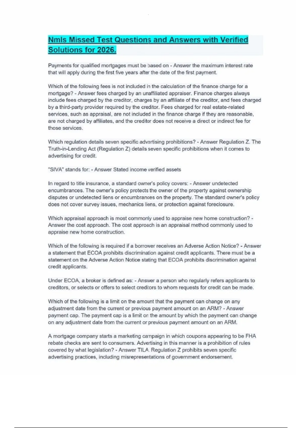 Nmls Missed Test Questions and Answers with Verified Solutions for 2026.Nmls Missed Test Questions and Answers with Verified Solutions for 2026.