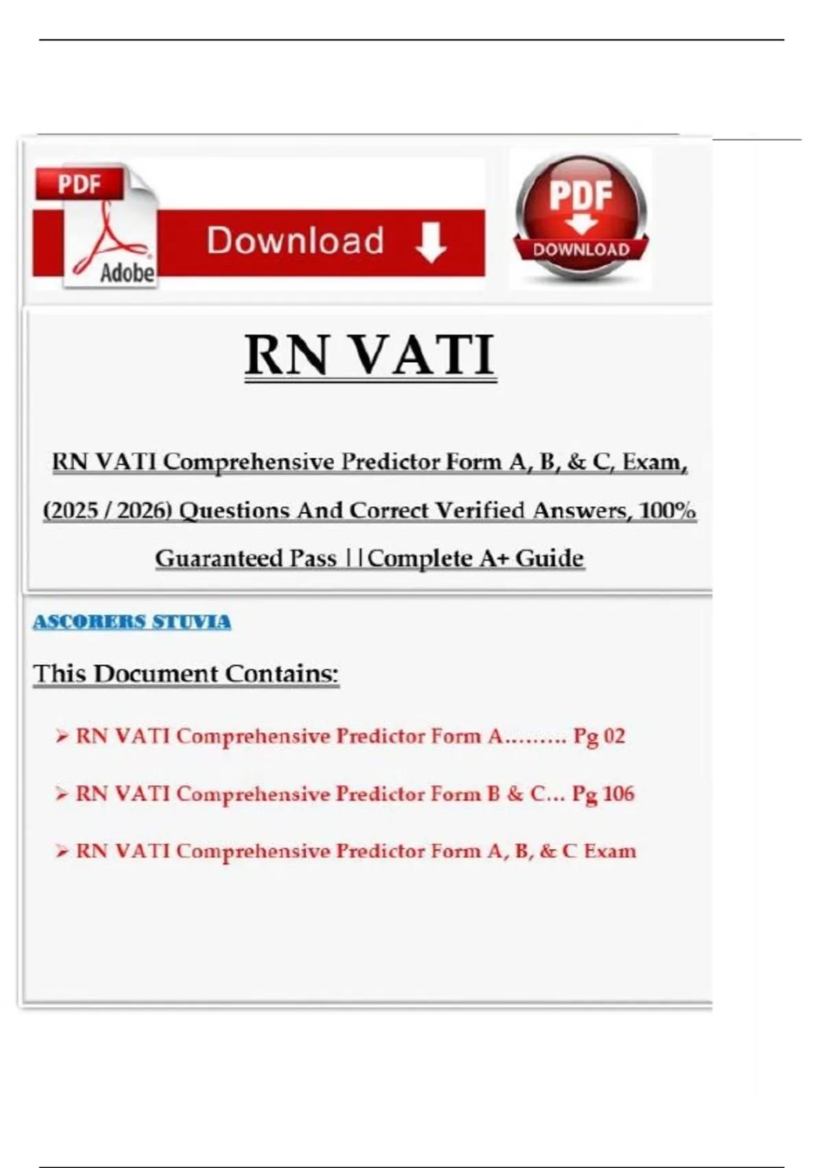 RN VATI Comprehensive Predictor Form A, B, & C, Exam, (2025 / 2026) Questions And Correct Verified Answers, 100% Guaranteed Pass ||Complete A+ Guide. This complete RN VATI Comprehensive Predictor Exam Guide covers Forms A, B, and C, fully updated for 2025 / 2026. It includes verified questions, correct answers, and detailed rationales designed to strengthen your understanding of key nursing concepts and prepare you for the ATI and NCLEX-RN exams with confidence. The guide provides full coverage of all major VATI domains, including Fundamentals, Pharmacology, Medical-Surgical, Maternal-Newborn, Pediatrics, Mental Health, and Leadership/Management. Each question is carefully reviewed and aligned with the latest NCLEX Next Generation (NGN) standards, helping nursing students improve clinical reasoning and testing performance. Ideal for RN students preparing for the Virtual ATI Predictor or Comprehensive Exit Exam, this A+ resource provides the clarity, accuracy, and depth needed to achieve guaranteed success. Whether for first-time testing or retakes, it’s a trusted companion for mastering nursing exam readiness. #RNVATI #VATIComprehensivePredictor #VATI2025 #VATI2026 #ATIPredictor #NursingExamPrep #ATIStudyGuide #NCLEXRN #NursingSuccess #VATIFormsABC #APlusGuide #ComprehensiveExitExam #NursingRationales #VirtualATI #NextGenerationNCLEX