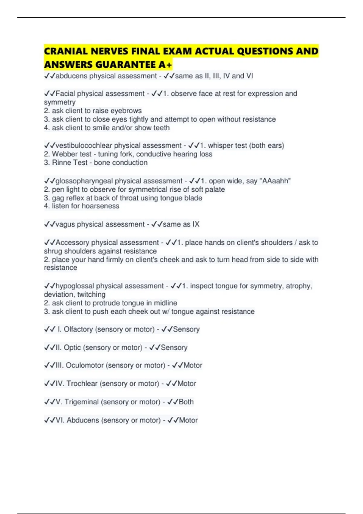 CRANIAL NERVES FINAL EXAM ACTUAL QUESTIONS AND ANSWERS GUARANTEE A+
