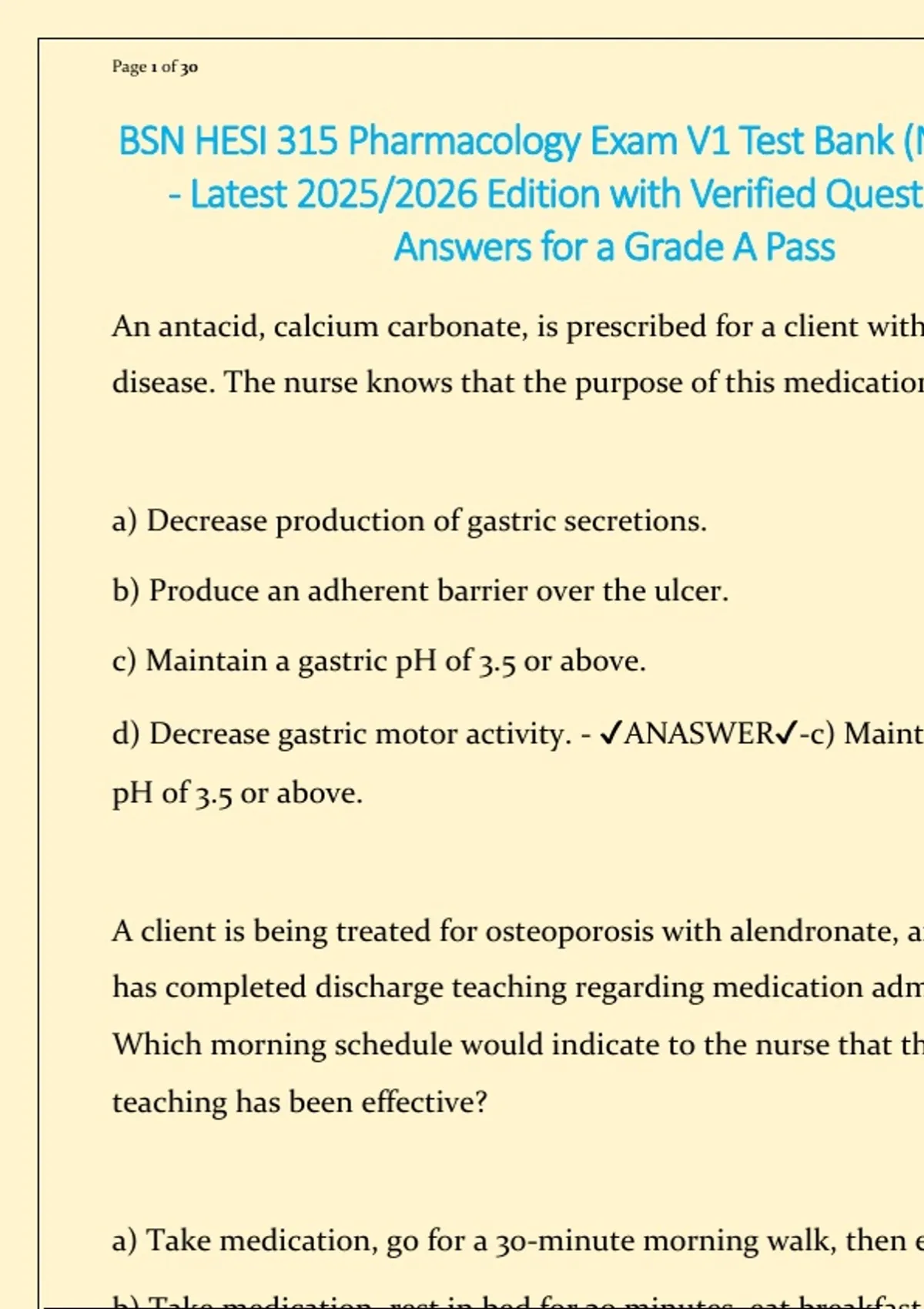 BSN HESI 315 Pharmacology Exam V1 Test Bank (Nightingale) - Latest 2025/2026 Edition with Verified Questions and Answers for a Grade A Pass