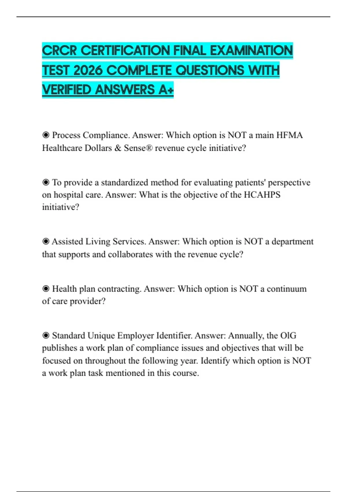 CRCR CERTIFICATION FINAL EXAMINATION TEST 2026 COMPLETE QUESTIONS WITH VERIFIED ANSWERS A+