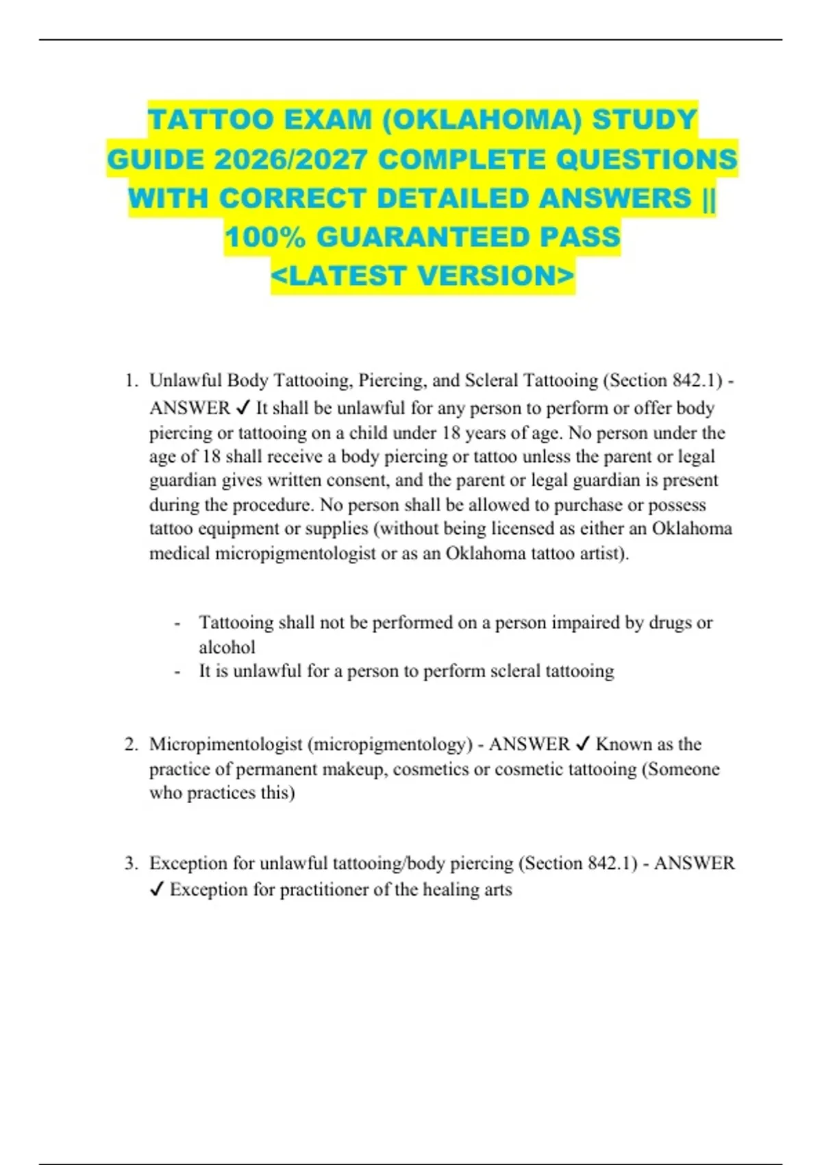 TATTOO EXAM (OKLAHOMA) STUDY GUIDE 2026/2027 COMPLETE QUESTIONS WITH CORRECT DETAILED ANSWERS || 100% GUARANTEED PASS &lt;LATEST VERSION&gt; 1. Unlawful Body Tattooing, Piercing, and Scleral Tattooing (Section 842.1) - ANSWER It shall be unlawful for any person to perform or offer body piercing or tattooing on a child under 18 years of age. No person under the age of 18 shall receive a body piercing or tattoo unless the parent or legal guardian gives written consent, and the parent or legal guardian is present during the procedure. No person shall be allowed to purchase or possess tattoo equipment or supplies (without being licensed as either an Oklahoma medical micropigmentologist or as an Oklahoma tattoo artist). - Tattooing shall not be performed on a person impaired by drugs or alcohol - It is unlawful for a person to perform scleral tattooing 2. Micropimentologist (micropigmentology) - ANSWER Known as the practice of permanent makeup, cosmetics or cosmetic tattooing (Someone who practices this) 3. Exception for unlawful tattooing/body piercing (Section 842.1) - ANSWER Exception for practitioner of the healing arts 4. Practitioners of the healing arts - ANSWER Practice podiactric medicine and surgery, nursing, chiropractic, optometry, dentistry, osteopathic medicine and surgery, medicine or surgery to provide health services. 5. Scleral Tattooing - ANSWER Practice of producing an indelible mark or figure on the human eye by scarring or inserting pigment on, in, or under the fornix conjunctiva, bulbar conjunctiva, ocular conjunctive, or other ocular surface using needles, scalpels or other related equipment. 6. A minimum of one pair of exam gloves shall be used for each stage of body piercing or tattooing procedure - ANSWER 1. Hard surface disinfection 2. Set up of instruments used for body piercing or tattooing 3. Preparation for body art area 4. The body piercing or tattoo procedure 7. What is the minimum number of times you should change your gloves for a body piercing or tattoo procedure? - ANSWER 4 times 8. Germicidal solution - ANSWER cleansing agent that kills disease causing microorganisms on hard surfaces and is a disinfectant or sanitizer registered with the Environmental Protection Agency. 9. Germicidal soap - ANSWER Agent designed for use on the skin that kills disease causing microorganisms 10. Handwashing facility - ANSWER sink equipped with hot and cold running water or tempered running water under pressure 11. HBV - ANSWER Hepatitis B Virus - DNA virus - has a vacine - attacks the liver - usually transmitted from mother to child - can remain active on a surface for up to 7 days - can survive extreme temps 12. HCV - ANSWER Hepatitis C Virus - RNA virus - Has a cure; antiviral pill - found in the blood of a person who has disease - attacks the liver - short life span outside of the human body, on room temp surfaces - usually transmitted through unclean needles 13. Dermis - ANSWER middle layer of skin (where the ink lives) 14. Epidermis - ANSWER outermost layer of skin (What ink passes thru) 15. Subcutaneous - ANSWER innermost layer of skin (fat layer = blow outs) 16. How much bleach should be in mop water? - ANSWER 1/10 17. statim autoclave - ANSWER a brand of autoclave utilizing the steam flush pressure pulse method of sterilization. 18. Sterization - ANSWER a process resulting in the destruction of all forms of microbial life, including highly resistant bacterial spores. 19. Tattooing - ANSWER the practice of producing an indelible mark or figure on the human body by scarring or inserting a pigment under the skin using needles, scalpels, or other related equipment; provided that medical micropigmentation, performed pursuant to the provisions of the Oklahoma Medical Micropigmentation Regulation Act, shall not be construed to be tattooing 20. Tattoo operator - ANSWER any person who owns, controls, operates, conducts or manages any permanent tattooing establishment whether performing the work of tattooing or not 21. Temporary artist license - ANSWER a person that is not licensed through the State of Oklahoma that is a body piercing artist or tattoo artist doing temporary work at a licensed body piercing or tattoo establishment not to exceed 30 days. 22. Ultrasonic cleaning unit - ANSWER A piece of medical equipment utilizing ultrasound energy to thoroughly clean instruments for body piercing or tattooing. 23. Universal Precautions - ANSWER an approach to infection control that treats all human blood and certain human body fluids as if known to be infectious for Human Immunodeficiency Virus (HIV), Hepatitis B Virus (HBV), Hepatitis C Virus (HCV), and other bloodborne pathogens.