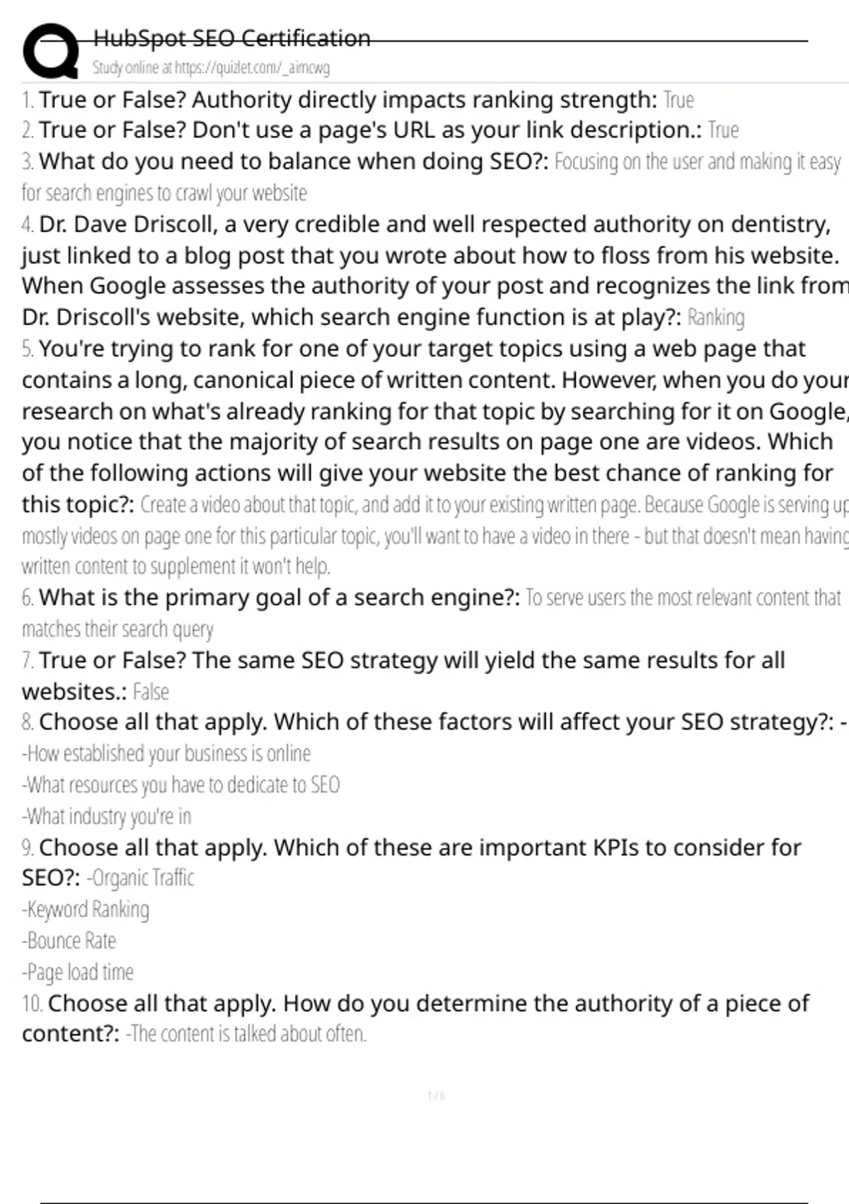 True or False? Authority directly impacts ranking strength: True 2. True or False? Don't use a page's URL as your link description.: True 3. What do you need to balance when doing SEO?: Focusing on the user and making it easy for search engines to crawl your website 4. Dr. Dave Driscoll, a very credible and well respected authority on dentistry, just linked to a blog post that you wrote about how to floss from his website. When Google assesses the authority of your post and recognizes the link from Dr. Driscoll's website, which search engine function is at play?: Ranking 5. You're trying to rank for one of your target topics using a web page that contains a long, canonical piece of written content. However, when you do your research on what's already ranking for that topic by searching for it on Google, you notice that the majority of search results on page one are videos. Which of the followin