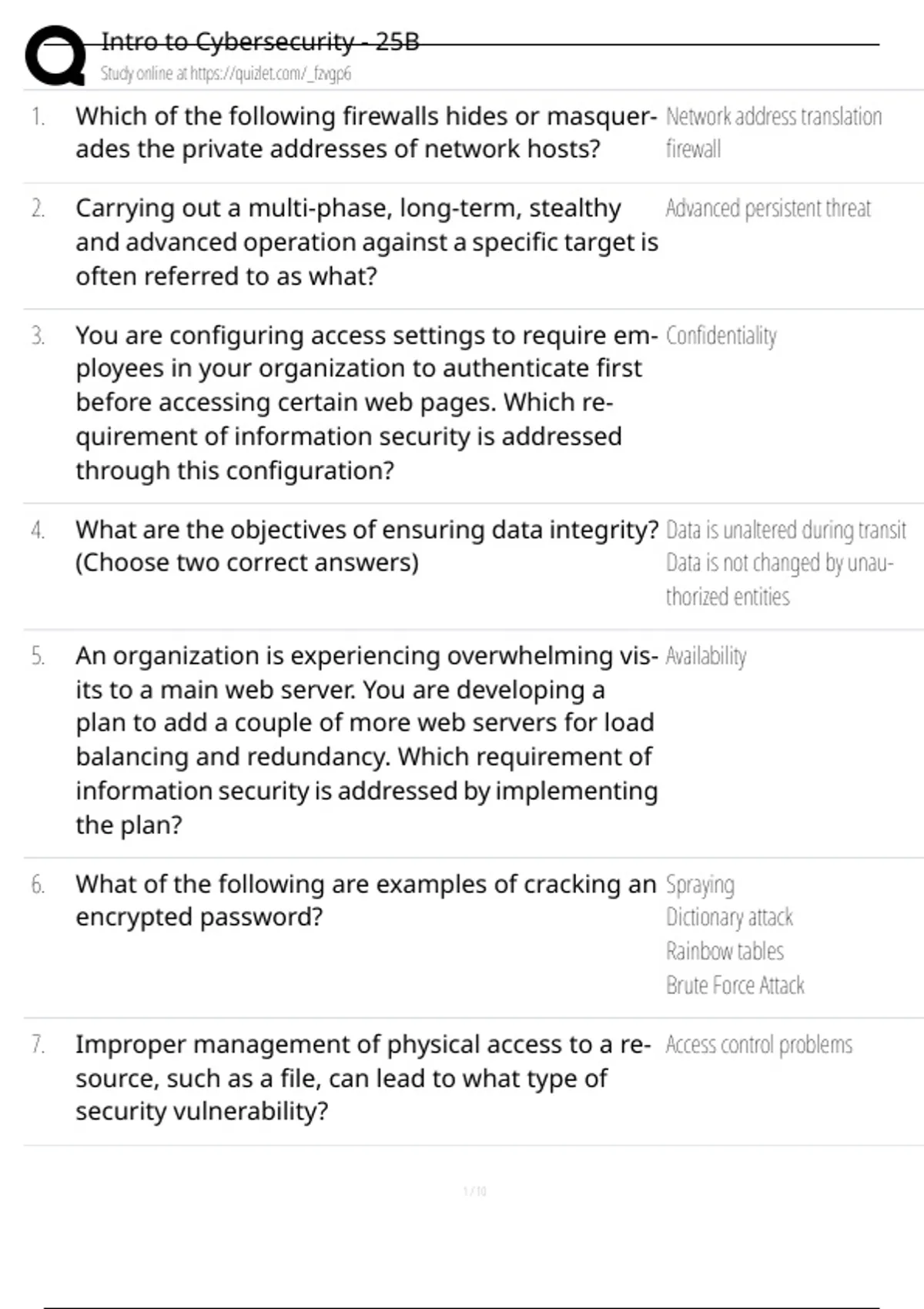 Which of the following firewalls hides or masquer- ades the private addresses of network hosts? Network address translation firewall 2. Carrying out a multi-phase, long-term, stealthy and advanced operation against a specific target is often referred to as what? Advanced persistent threat 3. You are configuring access settings to require em- ployees in your organization to authenticate first before accessing certain web pages. Which re- quirement of information security is addressed through this config