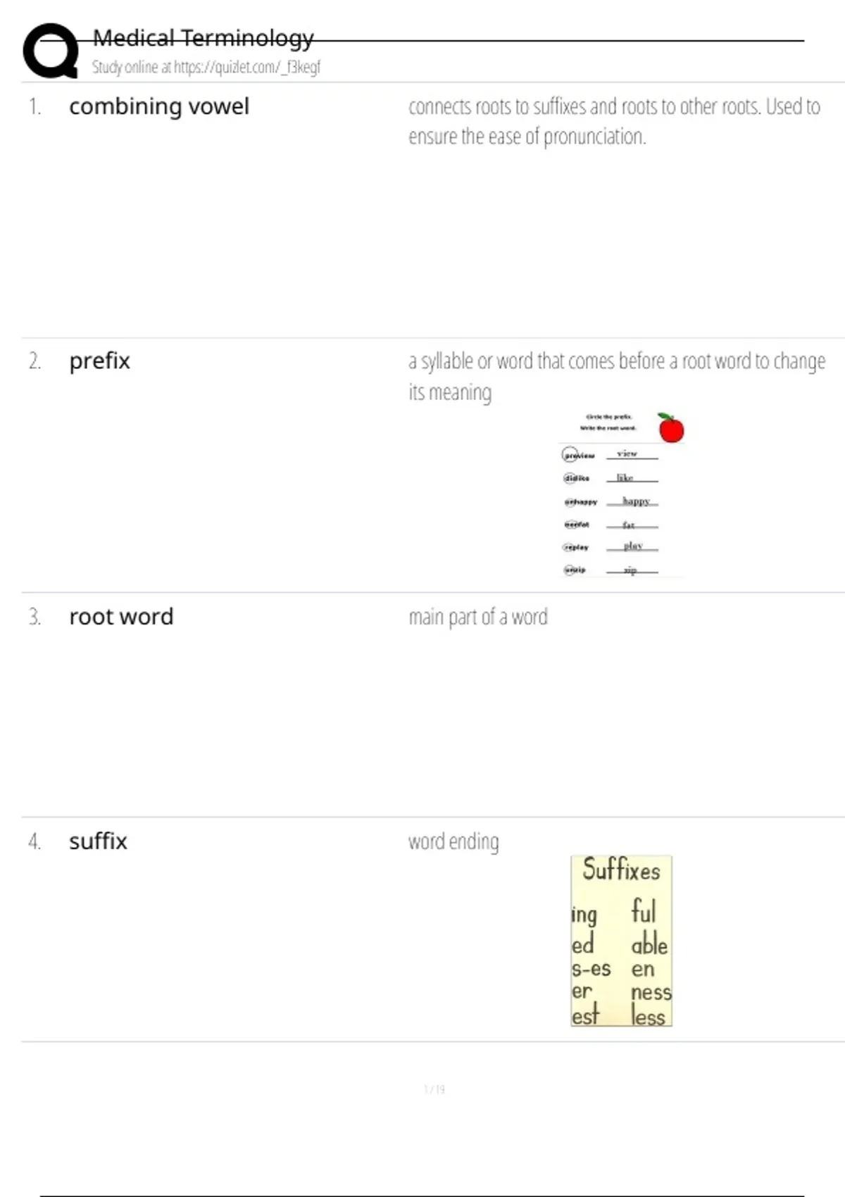 combining vowel connects roots to suffixes and roots to other roots. Used to ensure the ease of pronunciation. 2. prefix a