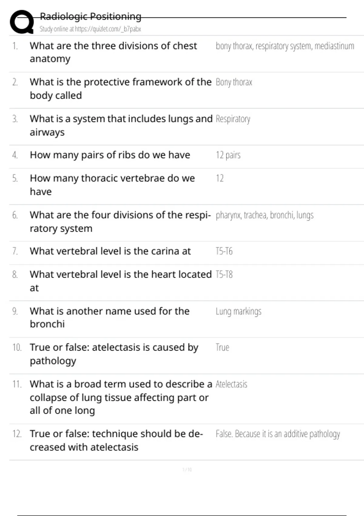 What are the three divisions of chest anatomy bony thorax, respiratory system, mediastinum 2. What is the protective framework of the body called Bony thorax 3. What is a system that includes lungs and airways Respiratory 4. How many p
