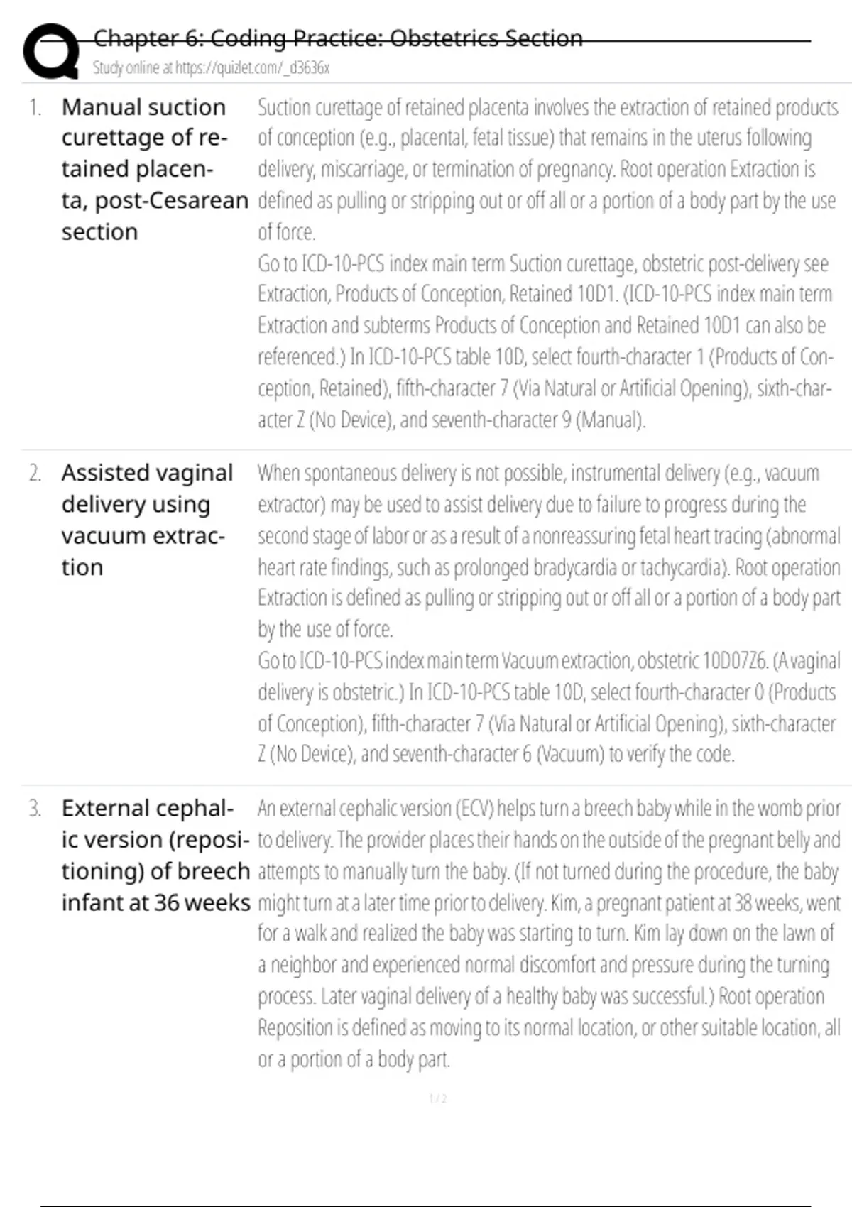 Manual suction curettage of re- tained placen- ta, post-Cesarean section Suction curettage of retained placenta involves the extraction of retained products of conception (e.g., placental, fetal tissue) that remains in the uterus following delivery, miscarriage, or termination of pregnancy. Root operation Extraction is defined as pulling or stripping out or off all or a portion of a body part by the use of force. Go to ICD-10-PCS index main term Suction curettage, obstetric post-delivery see Extraction, Products of Conception, Retained 10D1. (ICD-10-PCS index main term Extraction and subterms Products of Conception and Retained 10D1 can also be referenced.)