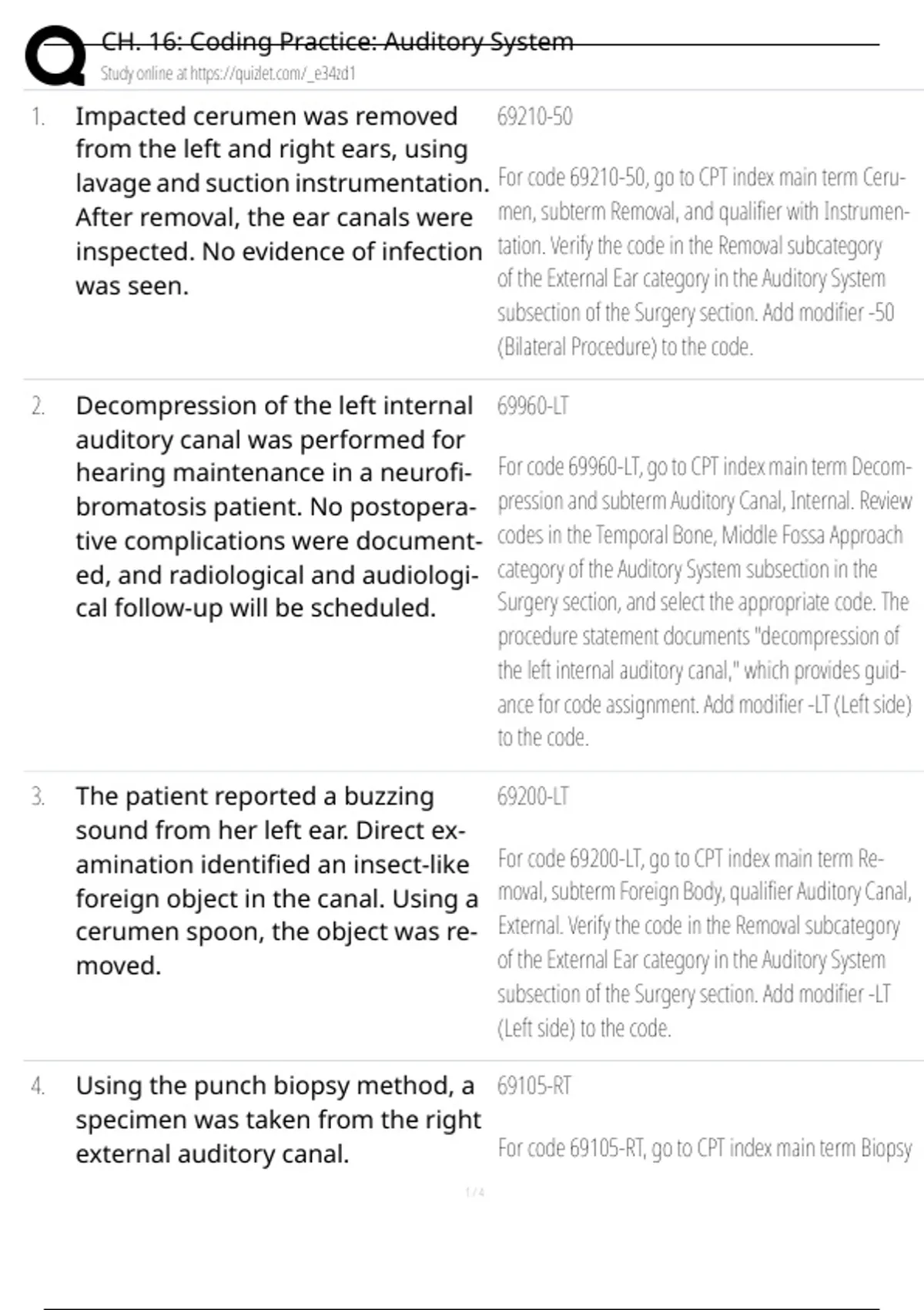 Impacted cerumen was removed from the left and right ears, using lavage and suction instrumentation. After removal, the ear canals were inspected. No evidence of infection was seen. 69210-50 For code 69210-50, go to CPT index main term Ceru- men, subterm Removal, and qualifier with Instrumen- tation. Verify the code in the Removal subcategory of the External Ear category in the Auditory System subsection of the Surgery section. Add modifier -50 (Bilateral Procedure) to the code. 2. Decompression of the left internal auditory canal was performed for hearing maintenance in a neurofi- bromatosis patient. No postopera- tive complications were document- ed, and radiological and audiologi- cal follow-up will be scheduled.