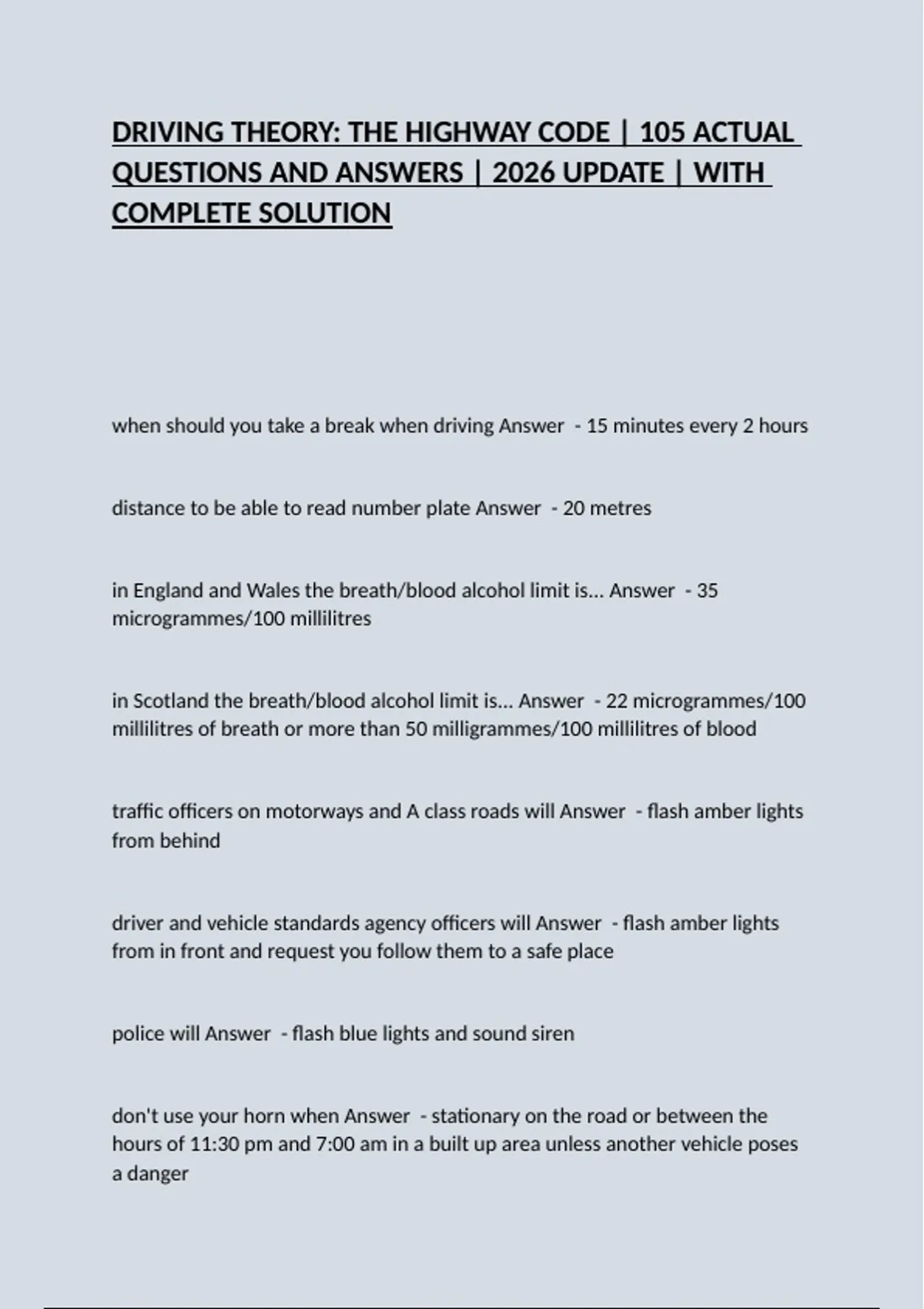 DRIVING THEORY: THE HIGHWAY CODE | 105 ACTUAL QUESTIONS AND ANSWERS | 2026 UPDATE | WITH COMPLETE SOLUTION