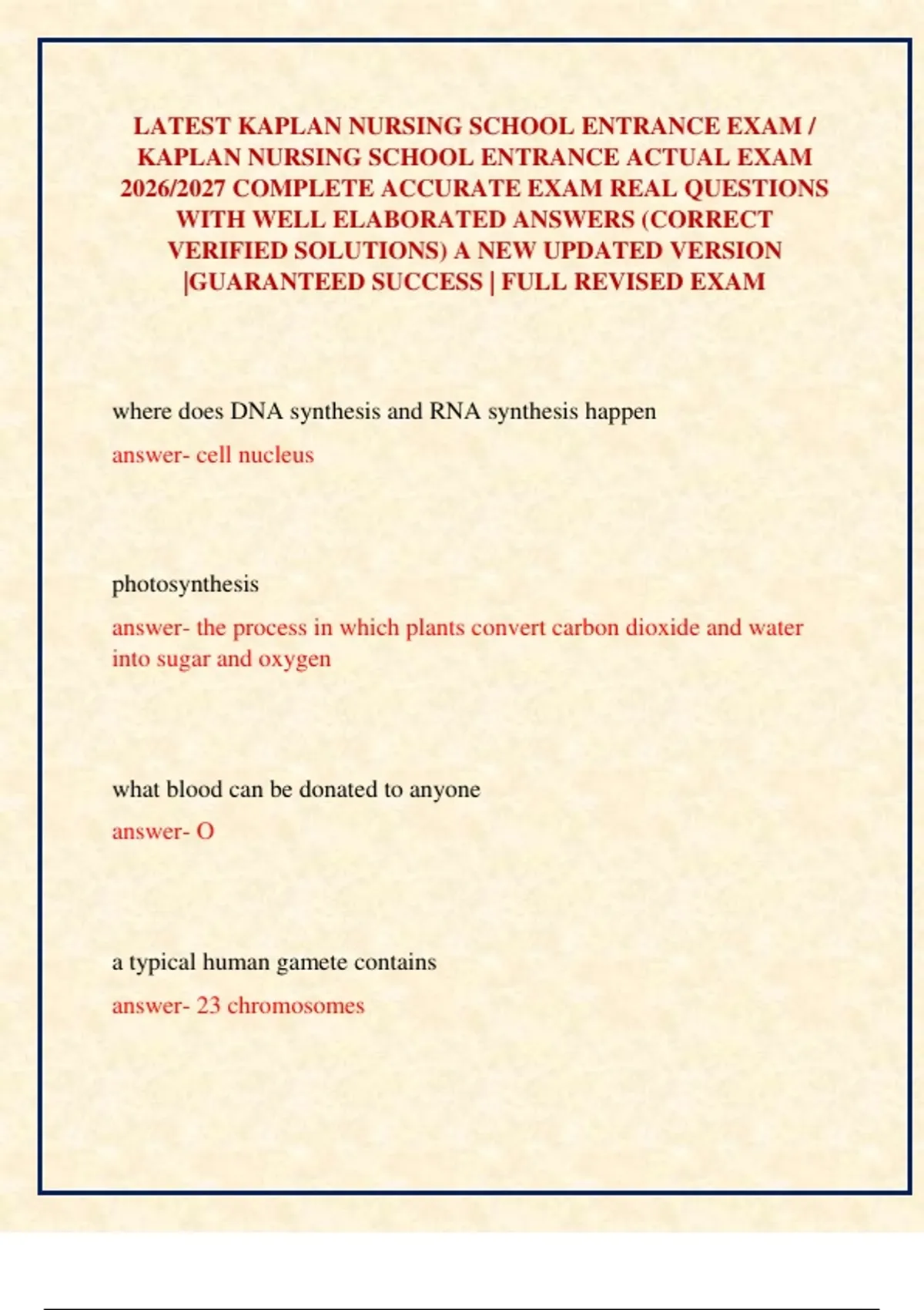 LATEST KAPLAN NURSING SCHOOL ENTRANCE EXAM / KAPLAN NURSING SCHOOL ENTRANCE ACTUAL EXAM 2026/2027 COMPLETE ACCURATE EXAM REAL QUESTIONS WITH WELL ELABORATED ANSWERS (CORRECT VERIFIED SOLUTIONS) A NEW UPDATED VERSION |GUARANTEED SUCCESS | FULL REVISED EXAM