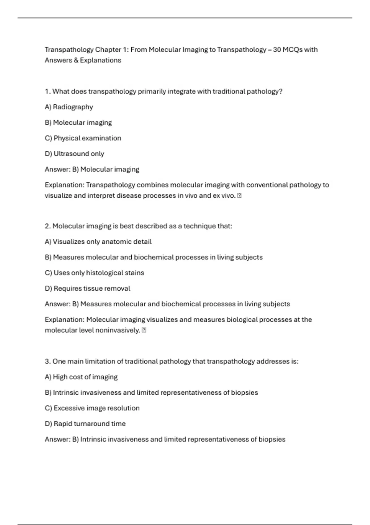 This document is a comprehensive multiple-choice question (MCQ) compendium based on Transpathology: Molecular Imagery-Based Pathology (1st Edition, edited by Mei Tian). It consolidates chapter-based MCQs from across the entire text (Chapters 1–29) into a single, structured study resource. The questions are designed at college and early graduate level, assessing both foundational knowledge and higher-order clinical reasoning in modern pathology. Each MCQ includes the correct answer and a concise, exam-focused explanation, making the document suitable for revision, self-assessment, and exam preparation. Content coverage includes: Molecular imaging principles (PET, SPECT, MRI, ultrasound, optical and photoacoustic imaging) Transpathology concepts and multiscale imaging Quantitative and multimodal imaging analysis AI, deep learning, and computational pathology Imaging of cellular processes, inflammation, infection, tissue repair, and drug delivery System-based pathology (cardiovascular, gastrointestinal, neurological, endocrine, pediatric, and oncologic pathology) Digital pathology and future directions in transpathology This resource is intended for medical, biomedical science, pathology, and imaging students, as well as early graduate learners seeking a structured question-based review aligned with contemporary transpathology education.