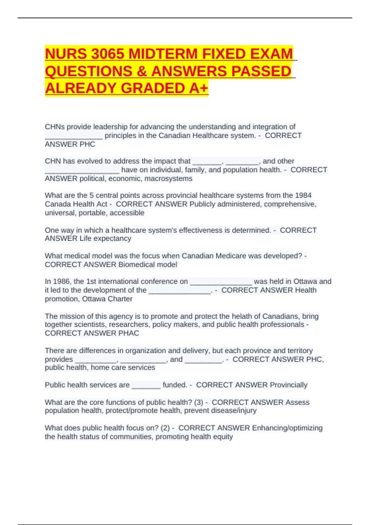NURS 3065 MIDTERM FIXED EXAM QUESTIONS & ANSWERS PASSED ALREADY GRADED A+ a nursing course focused on health assessment and health promotion within undergraduate nursing programs (often in BSN or RN-to-BSN curricula). Its exact title and structure may vary slightly by university, but the core aims are consistent.
