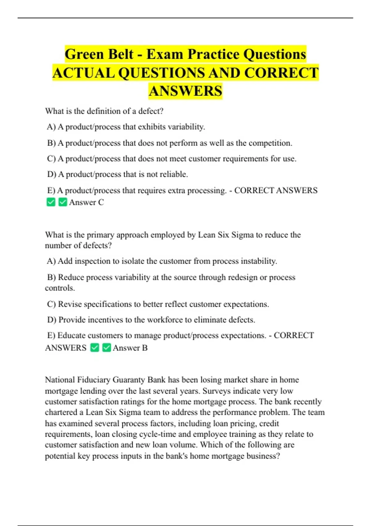 Green Belt - Exam Practice Questions ACTUAL QUESTIONS AND CORRECT ANSWERS What is the definition of a defect? A) A product/process that exhibits variability. B) A product/process that does not perform as well as the competition. C) A product/process that does not meet customer requirements for use. D) A product/process that is not reliable. E) A product/process that requires extra processing. - CORRECT ANSWERS Answer C