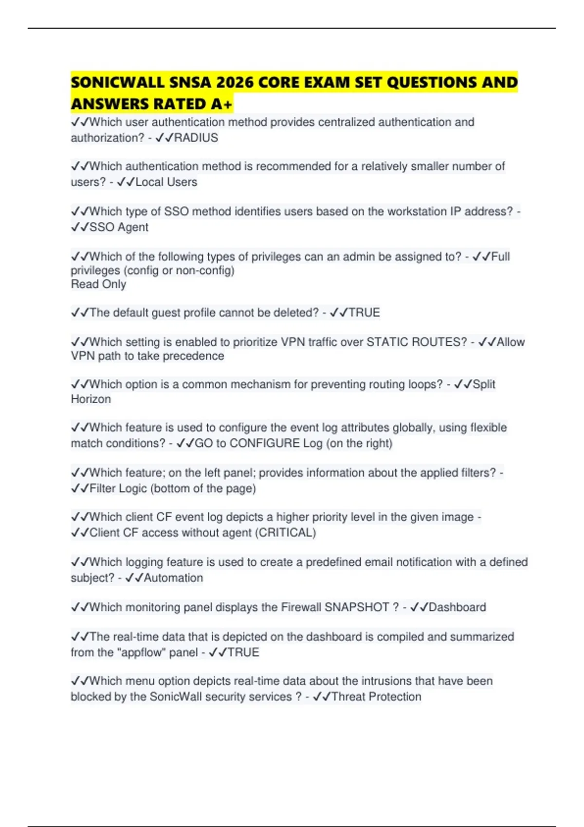 SONICWALL SNSA 2026 CORE EXAM SET QUESTIONS AND ANSWERS RATED A+