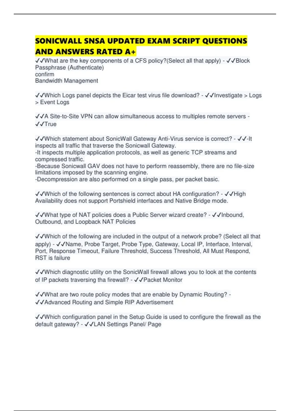 SONICWALL SNSA UPDATED EXAM SCRIPT QUESTIONS AND ANSWERS RATED A+
