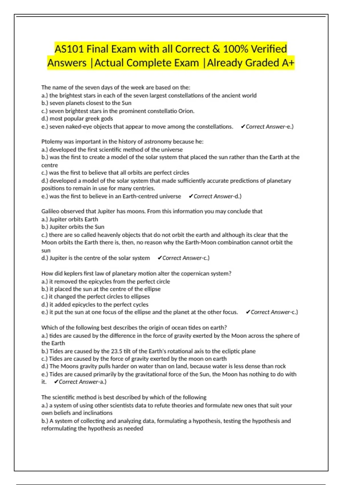 e.) was the first to believe in an Earth-centred universe ✔Correct Answer-d.)