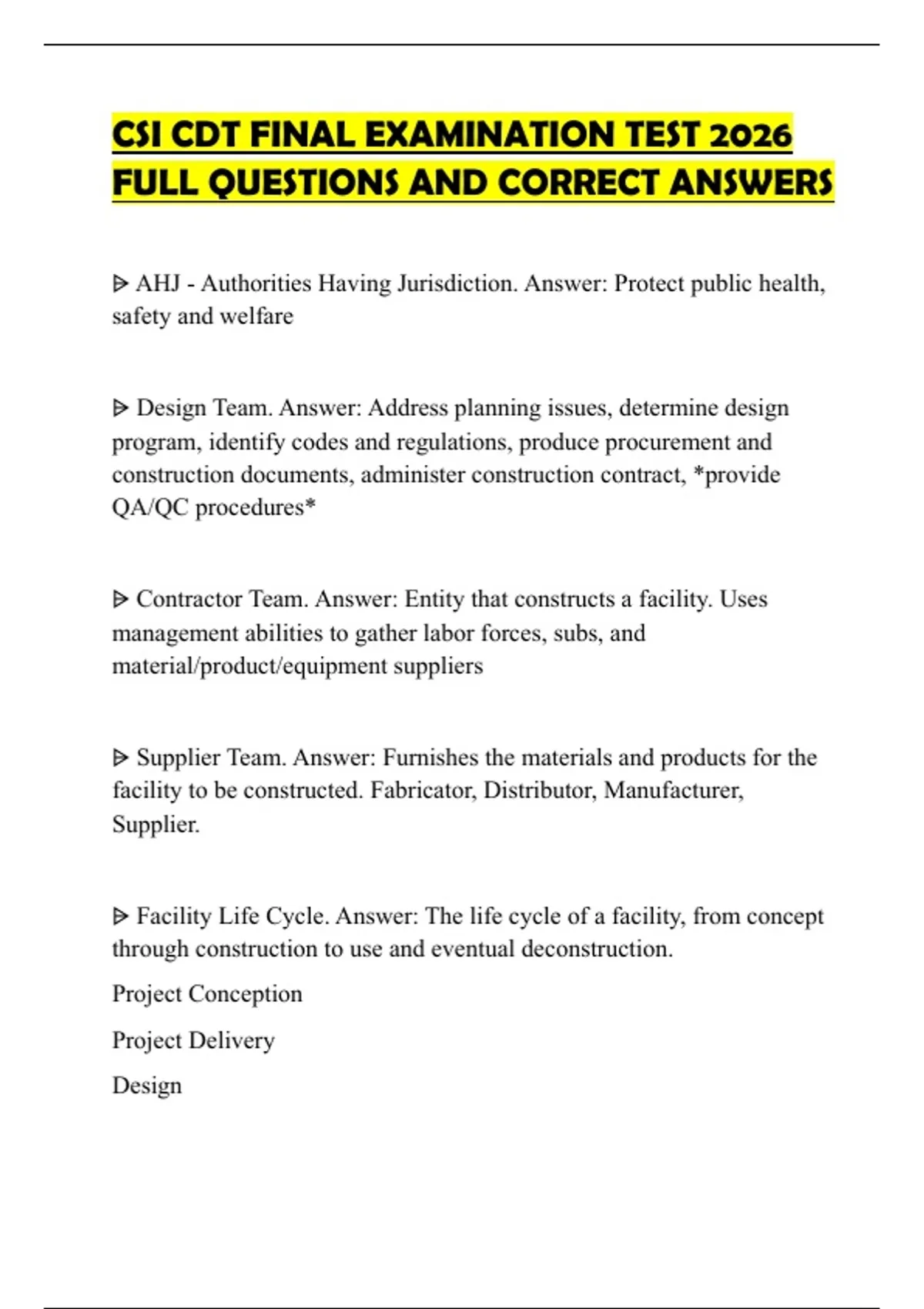 ⩥ Contractor Team. Answer: Entity that constructs a facility. Uses