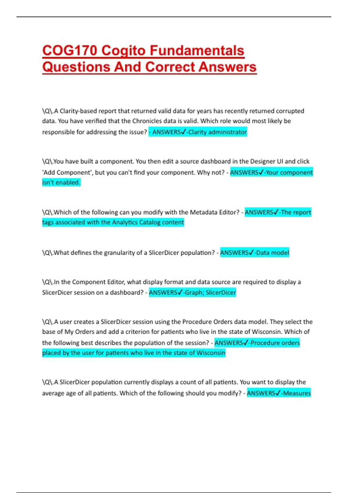 COG170 Cogito Fundamentals Questions And Correct Answers Q.A Clarity-based report that returned valid data for years has recently returned corrupted data. You have verified that the Chronicles data is valid. Which role would most likely be responsible for addressing the issue? - ANSWERS-Clarity administrator Q.You have built a component. You then edit a source dashboard in the Designer UI and click 'Add Component', but you can't find your component. Why not? - ANSWERS-Your component isn't enabled. Q.Which of the following can you modify with the Metadata Editor? - ANSWERS-The report tags associated with the Analytics Catalog content Q.What defines the granularity of a SlicerDicer population? - ANSWERS-Data model Q.In the Component Editor, what display format and data source are required to display a SlicerDicer session on a dashboard? - ANSWERS-Graph; SlicerDicer Q.A user creates a SlicerDicer session using the Procedure Orders data model. They select the base of My Orders and add a criterion for patients who live in the state of Wisconsin. Which of the following best describes the population of the session? - ANSWERS-Procedure orders placed by the user for patients who live in the state of Wisconsin Q.A SlicerDicer population currently displays a count of all patients. You want to display the average age of all patients. Which of the following should you modify? - ANSWERS-Measures