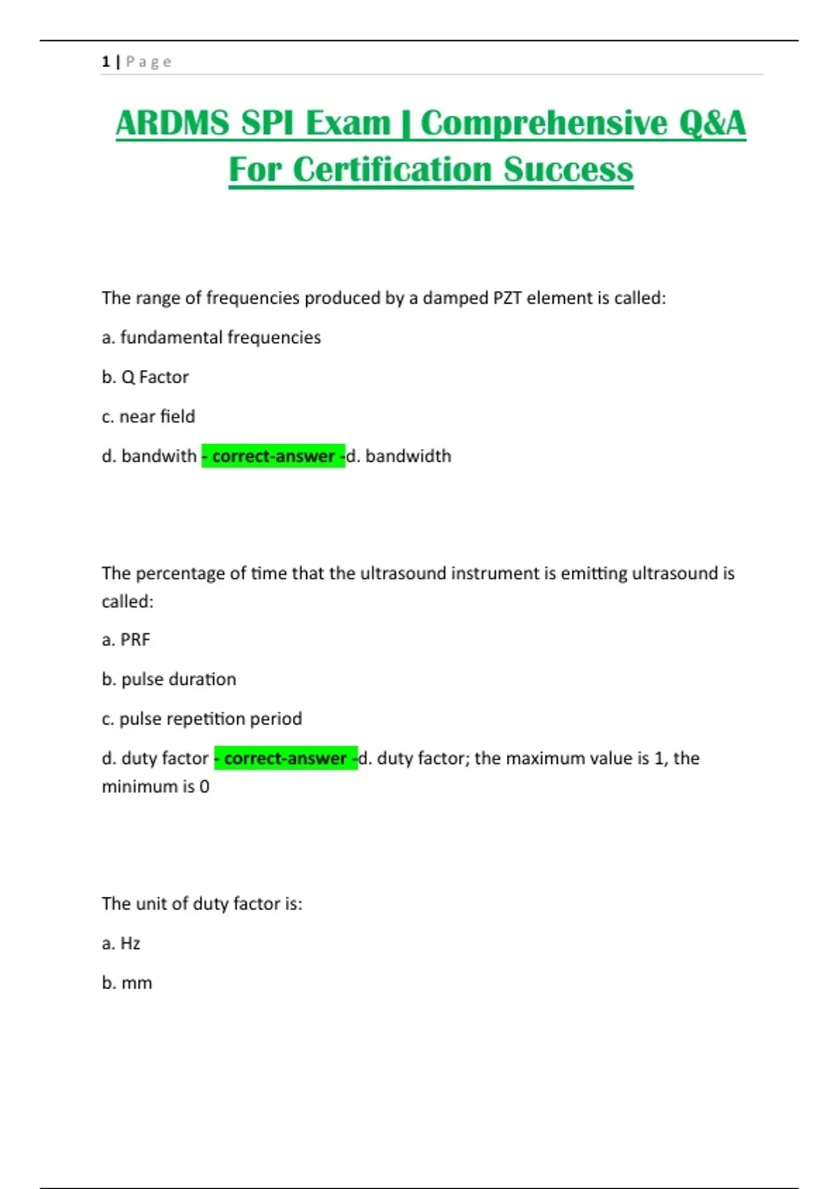 d. duty factor - correct-answer -d. duty factor; the maximum value is 1, the