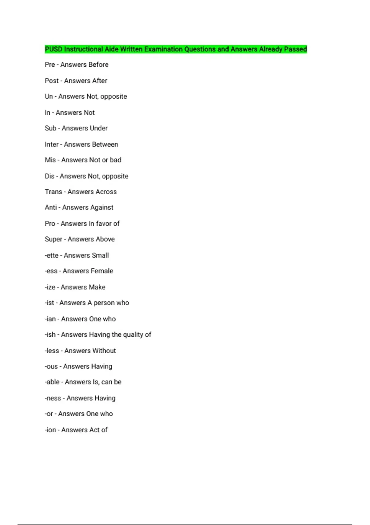 PUSD Instructional Aide Written Examination Questions and Answers Already Passed Pre - Answers Before Post - Answers After Un - Answers Not, opposite In - Answers Not Sub - Answers Under Inter - Answers Between Mis - Answers Not or bad Dis - Answers Not, opposite Trans - Answers Across Anti - Answers Against Pro - Answers In favor of Super - Answers Above -ette - Answers Small -ess - Answers Female -ize - Answers Make -ist - Answers A person who -ian - Answers One who -ish - Answers Having the quality of -less - Answers Without -ous - Answers Having -able - Answers Is, can be -ness - Answers Having -or - Answers One who -ion - Answers Act of