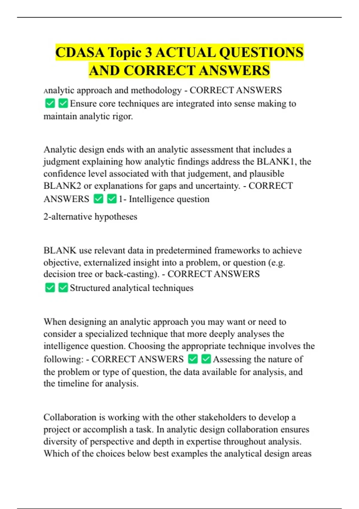 CDASA Topic 3 ACTUAL QUESTIONS AND CORRECT ANSWERS Analytic approach and methodology - CORRECT ANSWERS Ensure core techniques are integrated into sense making to maintain analytic rigor.